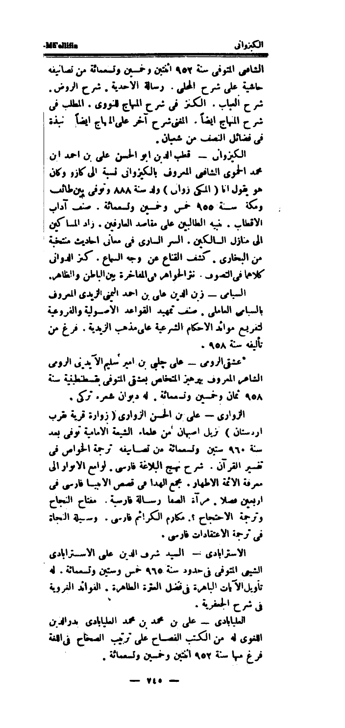 الكيزوانى - قطب الدَّين أَبُو الْحسن على بن احْمَد ابْن مُحَمَّد الحموى الشَّافِعِي الْمَعْرُوف بالكيزوانى نِسْبَة إِلَى كازو وَكَانَ هُوَ يَقُول انا (المكى زوانى) ولد سنة 888 وَتوفى بَين طائف وَمَكَّة سنة 955 خمس وَخمسين وَتِسْعمِائَة.