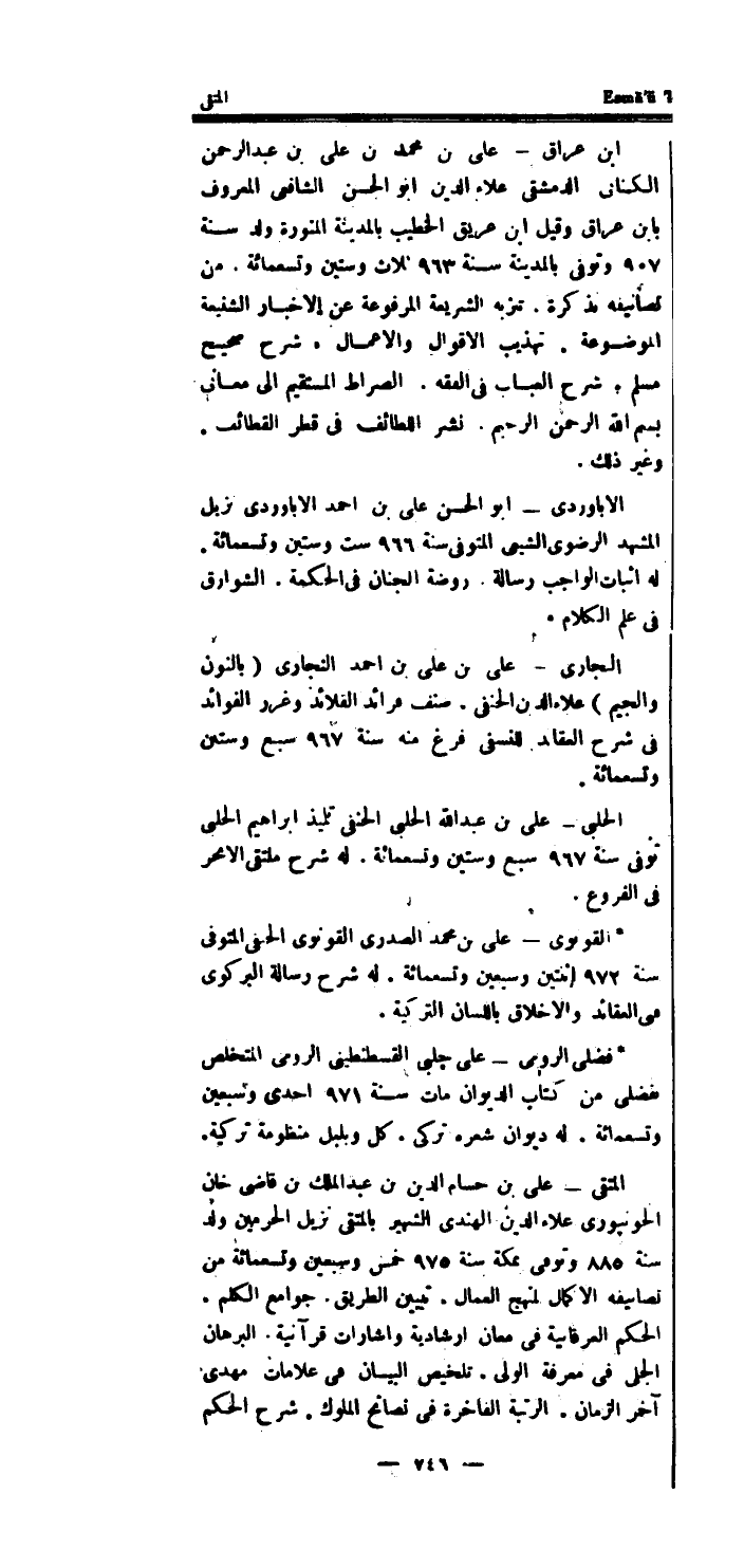 المتقى - على بن حسام الدَّين بن عبد الملك بن قاضى خَان الحونپورى عَلَاء الدَّين الْهِنْدِيّ الشهير بالمتقي نزيل الْحَرَمَيْنِ ولد سنة 885 وَتوفى بِمَكَّة سنة 975 خمس وَسبعين وَتِسْعمِائَة من تصانيفه الْكَمَال لمنهج الْعمَّال.