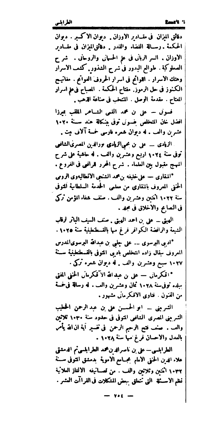 الطرابلسي - على بن نَاصِر الدَّين مُحَمَّد الطرابلسي ثمَّ الدِّمَشْقِي عَلَاء الدَّين الْحَنَفِيّ الامام بِجَامِع الاموية بِدِمَشْق الْمُتَوفَّى سنة 1032 اثْنَتَيْنِ وَثَلَاثِينَ والف.