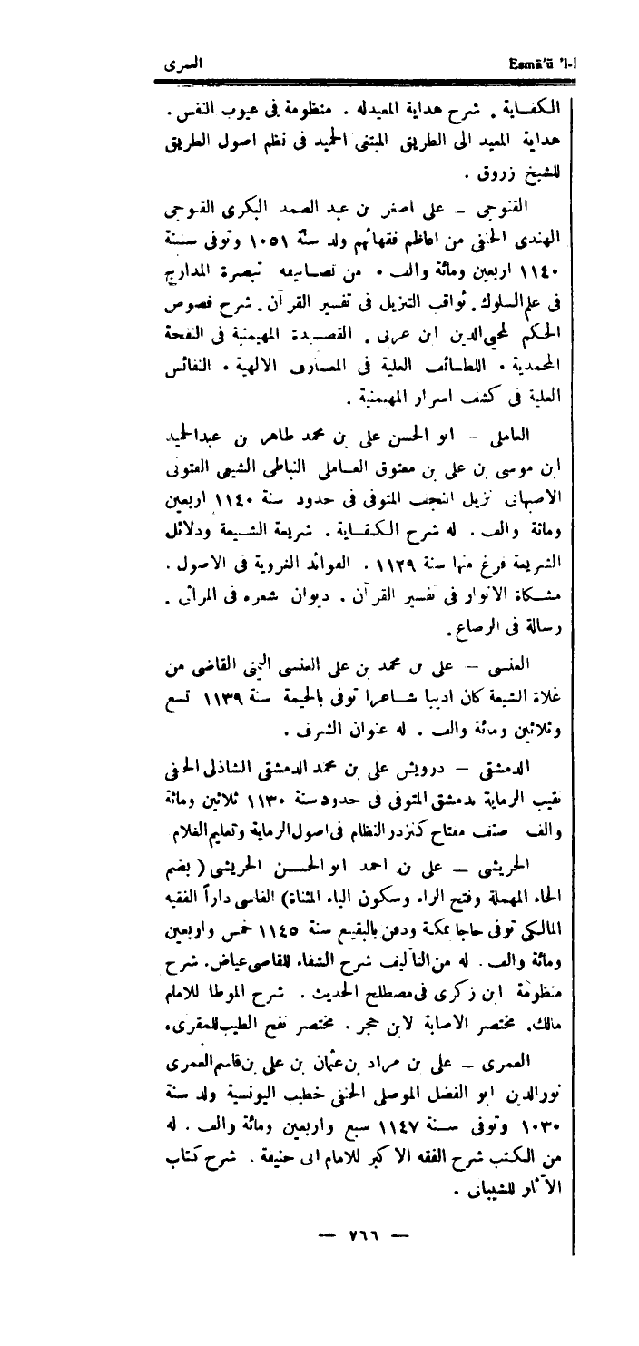 الْعُمْرَى - على بن مُرَاد بن عُثْمَان بن على بن قَاسم الْعُمْرَى نور الدَّين أَبُو الْفضل الْموصِلِي الْحَنَفِيّ خطيب اليونسية ولد سنة 1030 وَتوفى سنة 1147 سبع واربعين وَمِائَة والف.