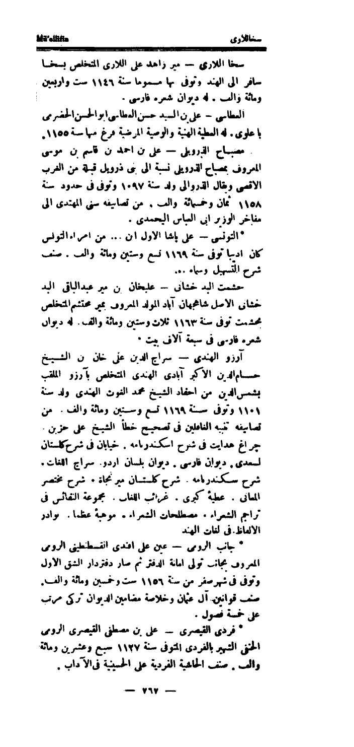 آرزو الْهِنْدِيّ - سراج الدَّين على خَان بن الشَّيْخ حسام الدَّين الاكبر آبادى الْهِنْدِيّ المتخلص بآرزو الملقب بشمس الدَّين من احفاد الشَّيْخ مُحَمَّد الْغَوْث الْهِنْدِيّ ولد سنة 1101 وَتوفى سنة 1169 تسع وَسِتِّينَ وَمِائَة والف.