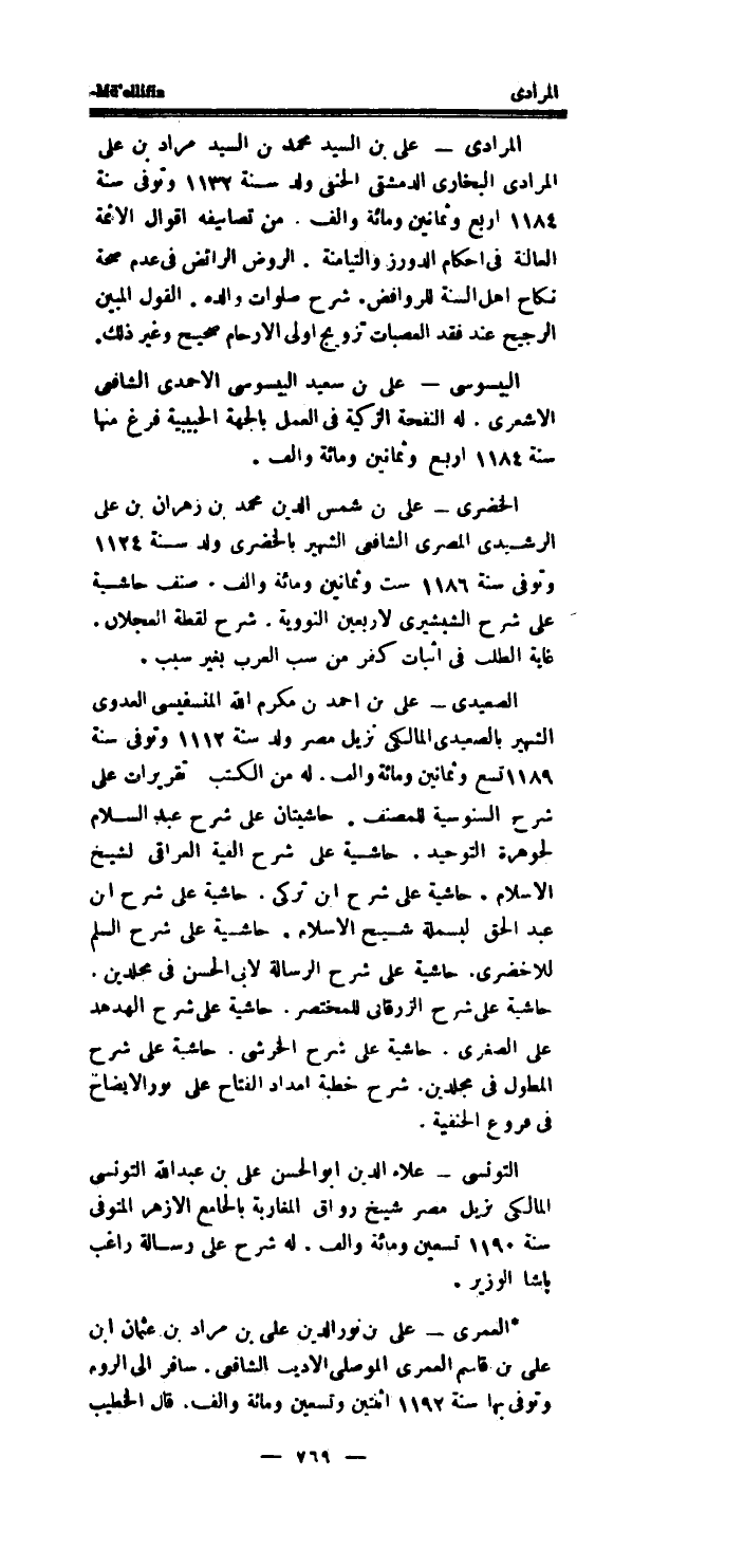 المرادى - على بن السَّيِّد مُحَمَّد بن السَّيِّد مُرَاد بن على المرادى البُخَارِيّ الدِّمَشْقِي الْحَنَفِيّ ولد سنة 1132 وَتوفى سنة 1184 ارْبَعْ وَثَمَانِينَ وَمِائَة والف.
