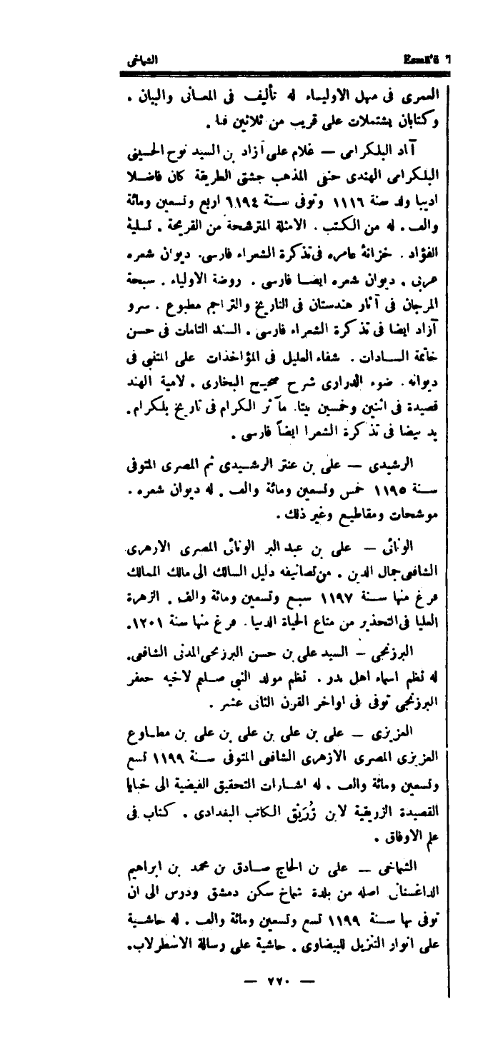 آزاد البلكرامى - غُلَام على آزاد بن السَّيِّد نوح الحسينى البلكرامى الْهِنْدِيّ حنفى الْمَذْهَب جشتى الطَّرِيقَة كَانَ فَاضلا اديبا ولد سنة 1161 وَتوفى سنة 1194 ارْبَعْ وَتِسْعين وَمِائَة والف.