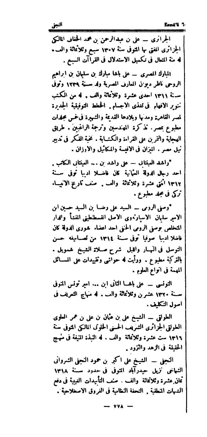 النجفي - الشَّيْخ على اكبر بن حمود النجفي الشروانى الشماخى نزيل حيدر آباد الْمُتَوفَّى فِي حُدُود سنة 1318 ثَمَان عشرَة وثلاثمائة والف.