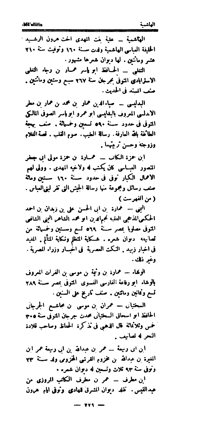 (من الفهرست) الْيُمْنَى - عمَارَة بن ابى الْحسن على بن زَيْدَانَ بن احْمَد الحكمى الْمذْحِجِي الْفَقِيه نجم الدَّين أَبُو مُحَمَّد الشَّاعِر الْيُمْنَى الشَّافِعِي الْمُتَوفَّى مصلوبا بِمصْر سنة 569 تسع وَسِتِّينَ وَخَمْسمِائة من تصانيفه ديوَان شعره.
