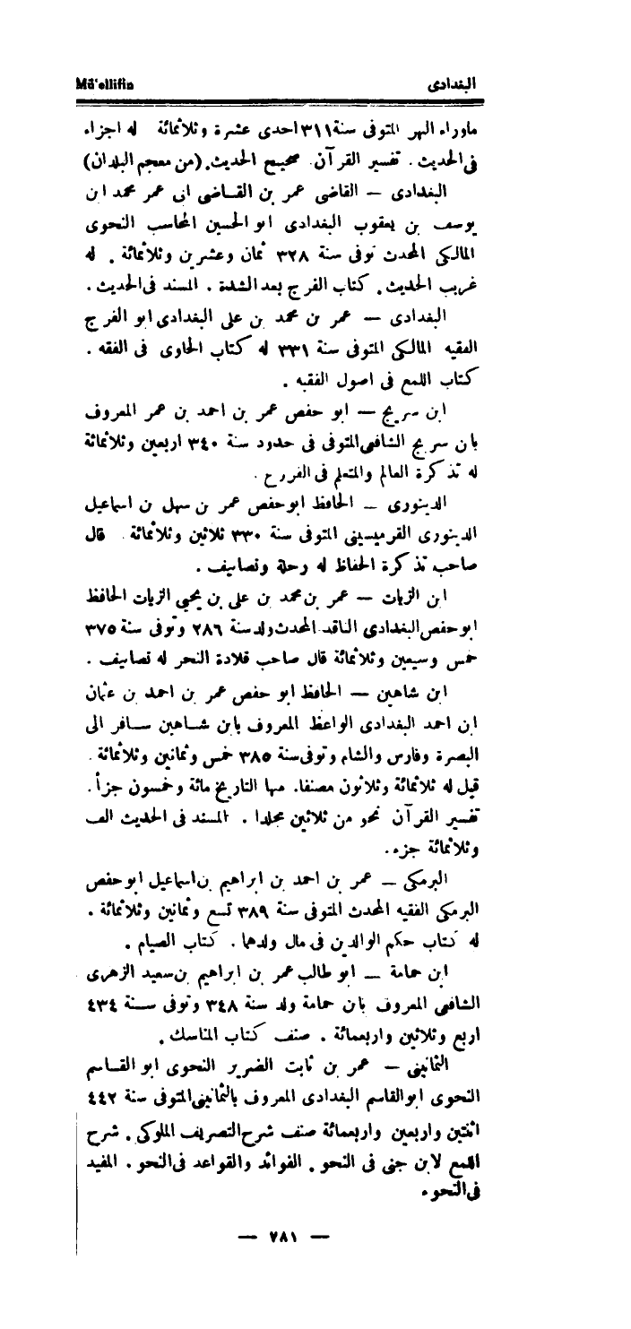 الْبَغْدَادِيّ - عمر بن مُحَمَّد بن على الْبَغْدَادِيّ أَبُو الْفرج الْفَقِيه المالكى الْمُتَوفَّى سنة 331 لَهُ كتاب الحاوى فِي الْفِقْه.