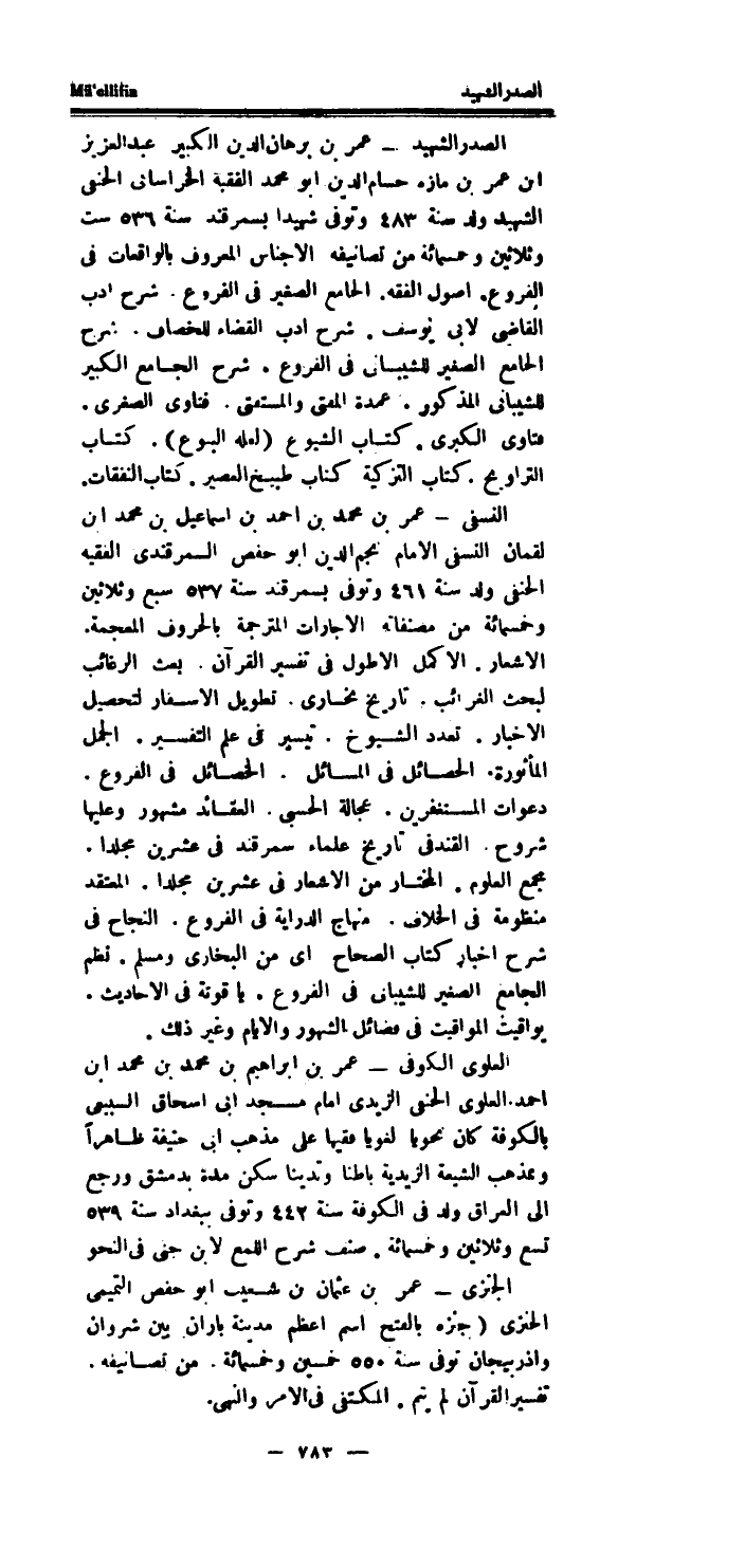 الصَّدْر الشَّهِيد - عمر بن برهَان الدَّين الْكَبِير عبد الْعَزِيز ابْن عمر بن مازه حسام الدَّين أَبُو مُحَمَّد الْفَقِيه الْخُرَاسَانِي الْحَنَفِيّ الشَّهِيد ولد سنة 483 وَتوفى شَهِيدا بسمرقند سنة 536 سِتّ وَثَلَاثِينَ وَخَمْسمِائة من تصانيفه الاجناس الْمَعْرُوف بالواقعات فِي الْفُرُوع.