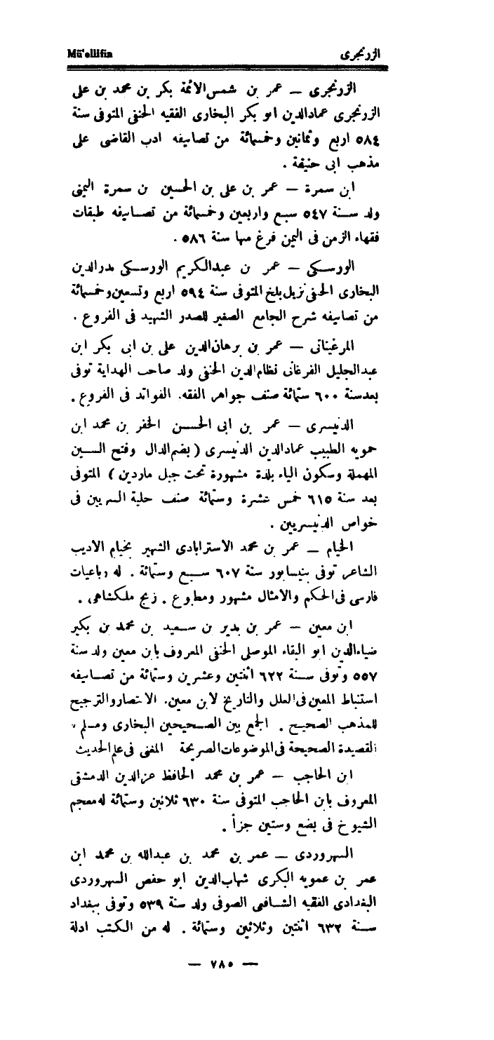 الزرنجرى - عمر بن شمس الائمة بكر بن مُحَمَّد بن على الزرنجرى عماد الدَّين أَبُو بكر البُخَارِيّ الْفَقِيه الْحَنَفِيّ الْمُتَوفَّى سنة 584 ارْبَعْ وَثَمَانِينَ وَخَمْسمِائة من تصانيفه ادب القاضى على مَذْهَب ابى حنيفَة.