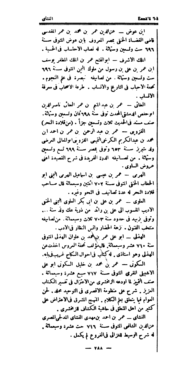 النشاى - عمر بن احْمَد بن مهدى النشاى المدلجى المصرى عز الدَّين الشَّافِعِي الْمُتَوفَّى سنة 716 سِتّ عشرَة وَسَبْعمائة.