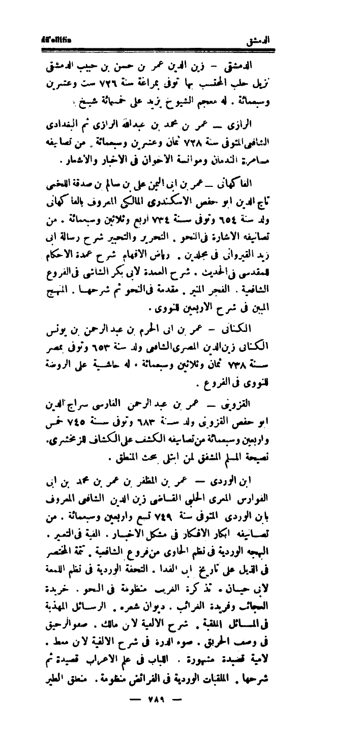 ابْن الوردى - عمر بن المظفر بن عمر بن مُحَمَّد بن ابى الفوارس المعرى الْحلَبِي القاضى زين الدَّين الشَّافِعِي الْمَعْرُوف بِابْن الوردى الْمُتَوفَّى سنة 749 تسع واربعين وَسَبْعمائة.
