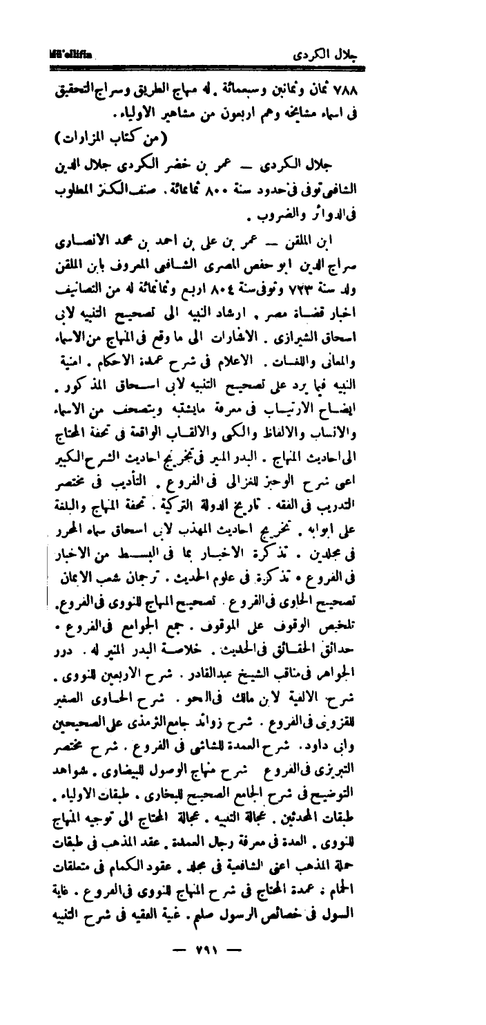 (من كتاب المزارات) جلال الكردى - عمر بن خضر الكردى جلال الدَّين الشَّافِعِي توفى فِي حُدُود سنة 800 ثَمَانمِائَة.