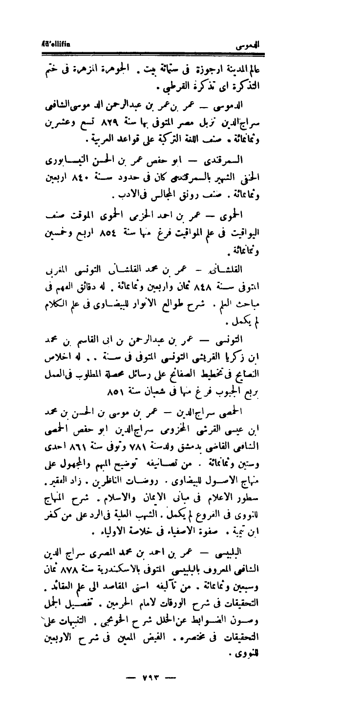 التونسى - عمر بن عبد الرحمن بن ابى الْقَاسِم بن مُحَمَّد ابْن زَكَرِيَّا القريشي التونسى الْمُتَوفَّى فِي سنة..لَهُ اخلاص النصايح فِي تخطيط الصفائح على رسائل محصلة الْمَطْلُوب فِي الْعَمَل بِربع الْجُيُوب فرغ مِنْهَا فِي شعْبَان سنة 851 الحمصى سراج الدَّين - عمر بن مُوسَى بن الْحسن بن مُحَمَّد ابْن عِيسَى القرشى المخزومى سراج الدَّين أَبُو حَفْص الحمصى الشَّافِعِي القاضى بِدِمَشْق ولد سنة 781 وَتوفى سنة 861 احدى وَسِتِّينَ وَثَمَانمِائَة.