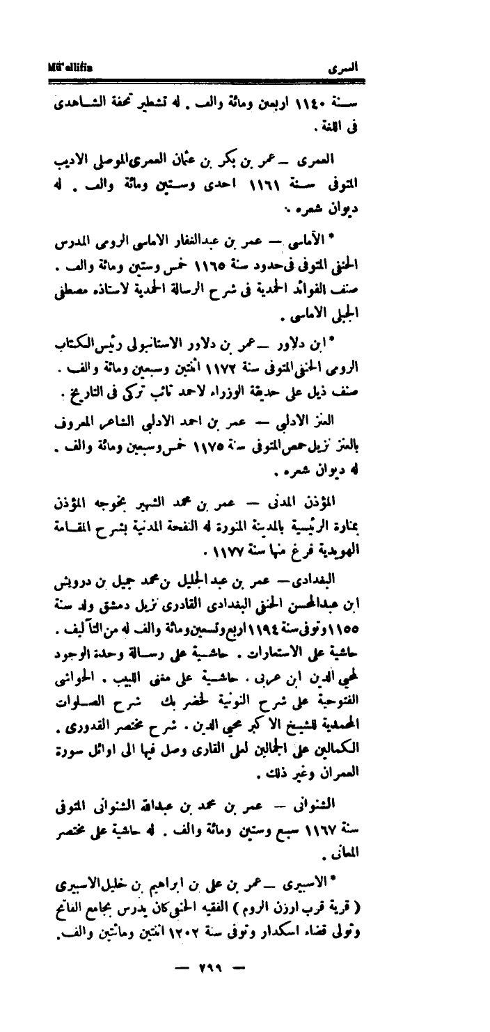 الْعُمْرَى - عمر بن بكر بن عُثْمَان الْعُمْرَى الْموصِلِي الاديب الْمُتَوفَّى سنة 1161 احدى وَسِتِّينَ وَمِائَة والف.