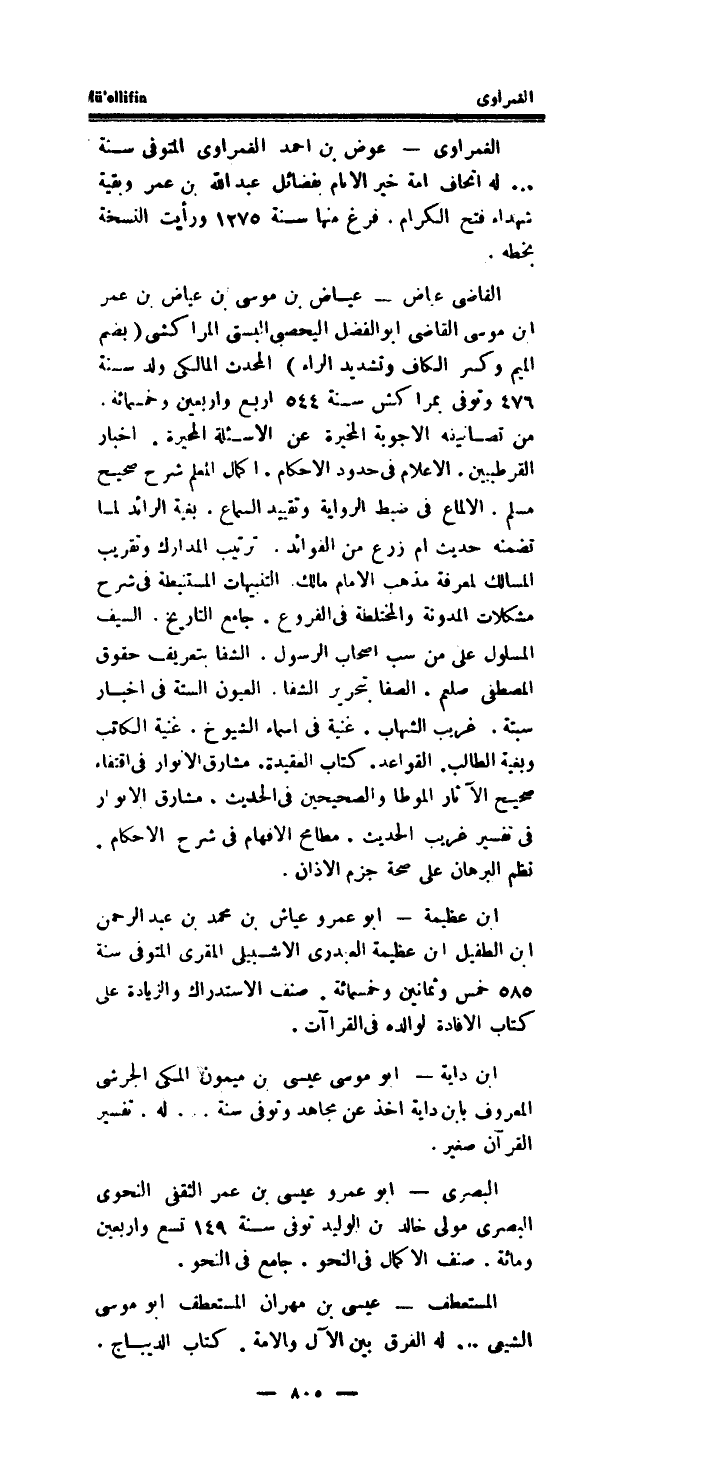 القاضى عِيَاض - عِيَاض بن مُوسَى بن عِيَاض بن عمر ابْن مُوسَى القاضى أَبُو الْفضل اليحصبى البستى المراكشي (بِضَم الْمِيم وَكسر الْكَاف وَتَشْديد الرَّاء) الْمُحدث المالكى ولد سنة 476 وَتوفى بمراكش سنة 544 ارْبَعْ واربعين وَخَمْسمِائة.