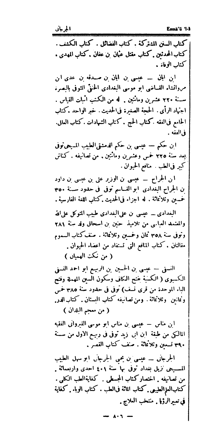 الْجِرْجَانِيّ - عِيسَى بن يحيى الْجِرْجَانِيّ أَبُو سهل الطَّبِيب المسيحي نزيل بغدادي توفى بهَا سنة 401 احدى واربعمائة.