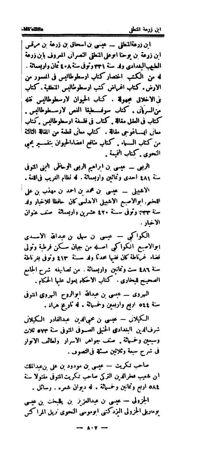 ابْن زرْعَة المنطقي - عِيسَى بن اسحاق بن زرْعَة بن مرقس ابْن زرْعَة بن يوحنا أَبُو على النمطقى النَّصْرَانِي الْمَعْرُوف بِابْن زرْعَة الطَّبِيب الْبَغْدَادِيّ ولد سنة 331 وَتوفى سنة 408 ثَمَان واربعمائة.