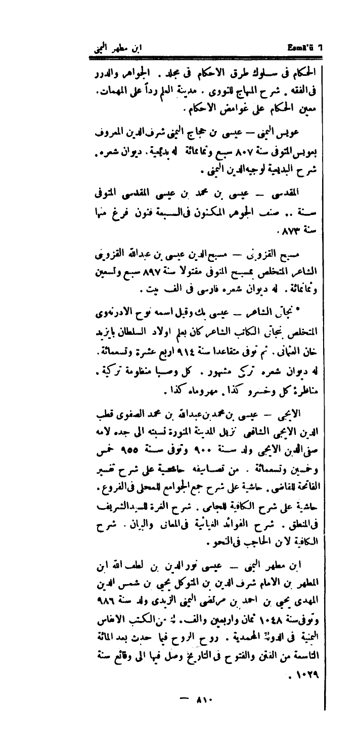 الايجى - عِيسَى بن مُحَمَّد بن عبد الله بن مُحَمَّد الصفوى قطب الدَّين الايجى الشَّافِعِي نزيل الْمَدِينَة المنورة نسبته إِلَى جده لامه صفى الدَّين الايجى ولد سنة 900 وَتوفى سنة 955 خمس وَخمسين وَتِسْعمِائَة.