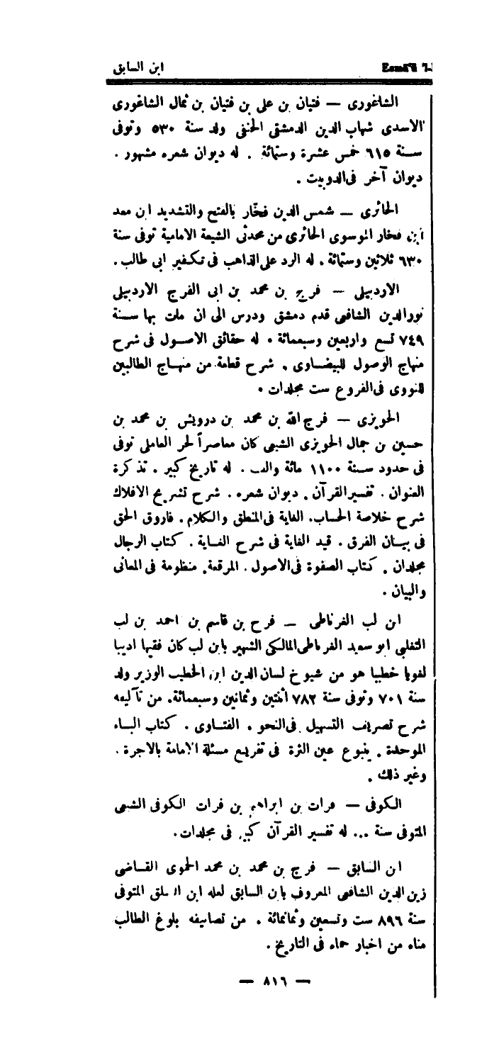 الاردبيلى - فرج بن مُحَمَّد بن ابى الْفرج الاردبيلى نور الدَّين الشَّافِعِي قدم دمشق ودرس إِلَى ان مَاتَ بهَا سنة 749 تسع واربعين وَسَبْعمائة.