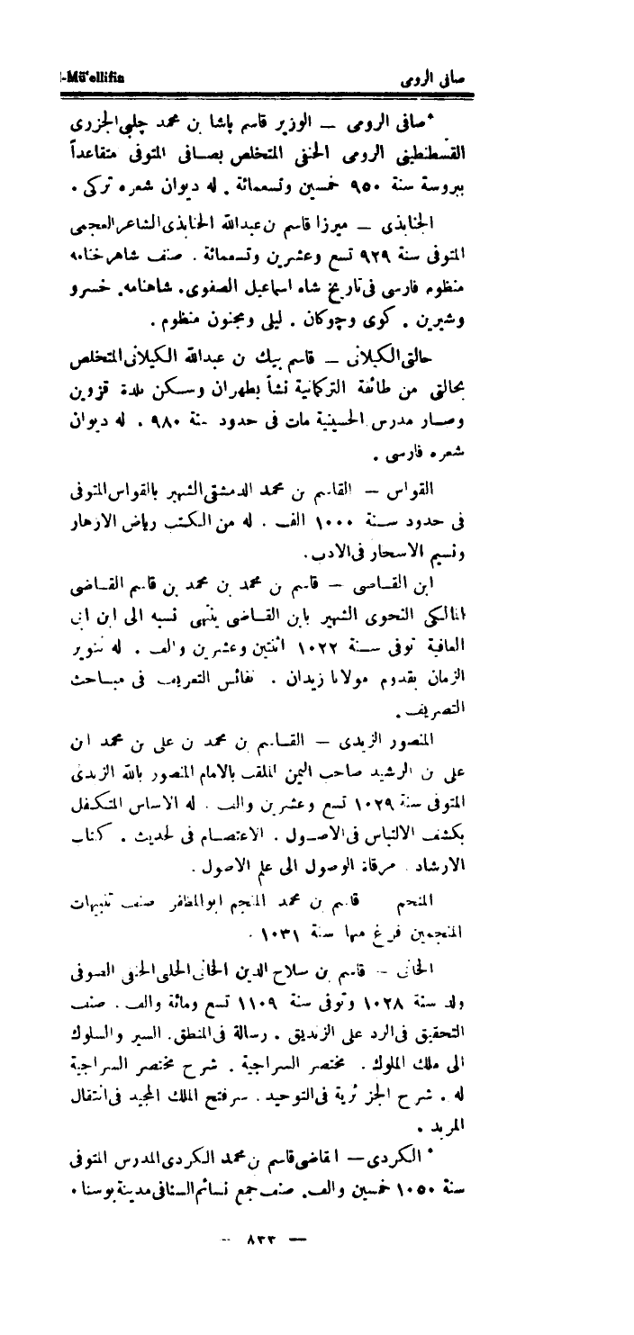 * صافى الرُّومِي - الْوَزير قَاسم پاشا بن مُحَمَّد چلبّى الجزرى القسطنطيني الرُّومِي الْحَنَفِيّ المتخلص بصافي الْمُتَوفَّى متقاعدا ببروسة سنة 950 خمسين وَتِسْعمِائَة.