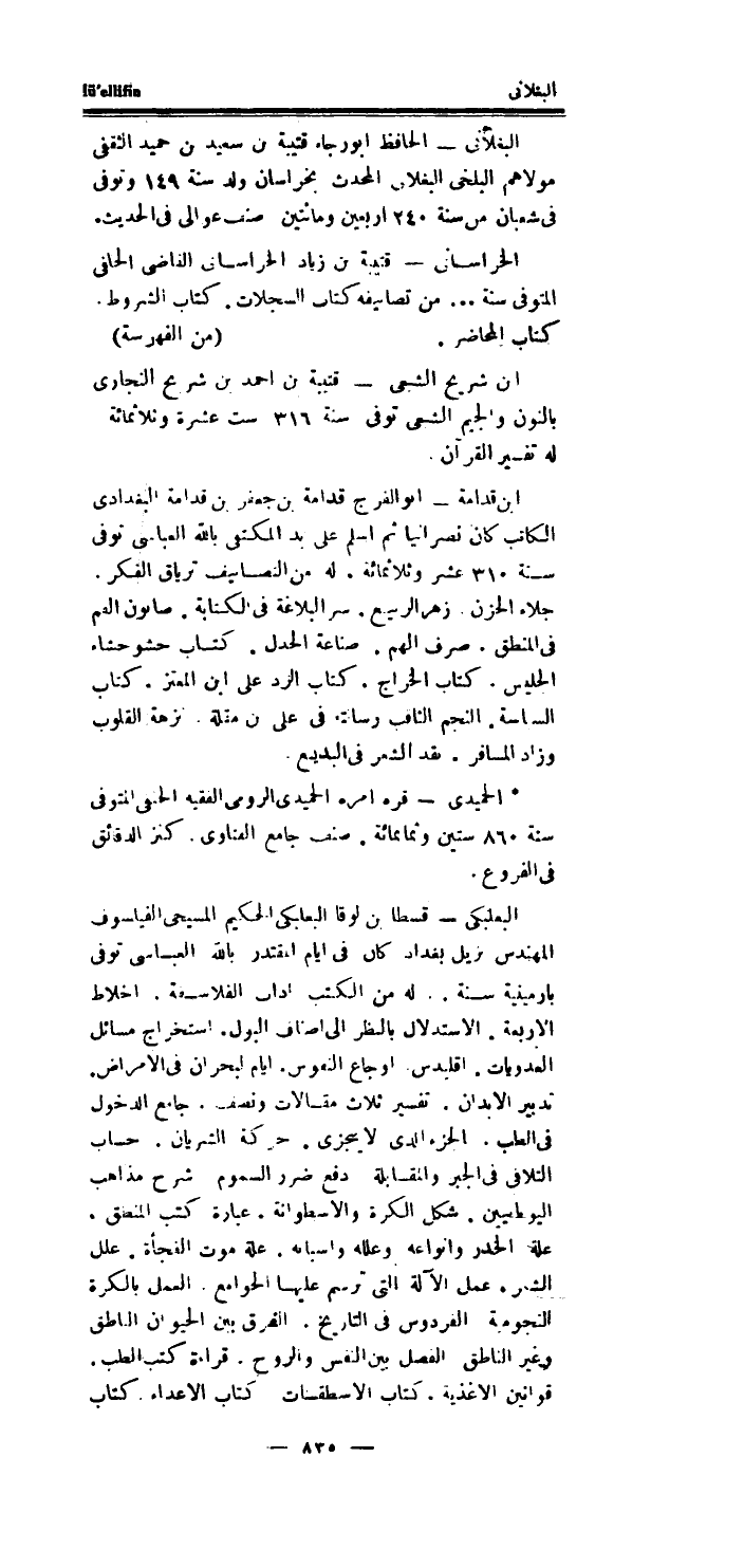 البعلبكي - قسطا بن لوقا البعلبكي الْحَكِيم المسيحي الفيلسوف المهندس نزيل بَغْدَاد كَانَ فِي ايام المقتدر بِاللَّه العباسي توفى بارمينية سنة ...
