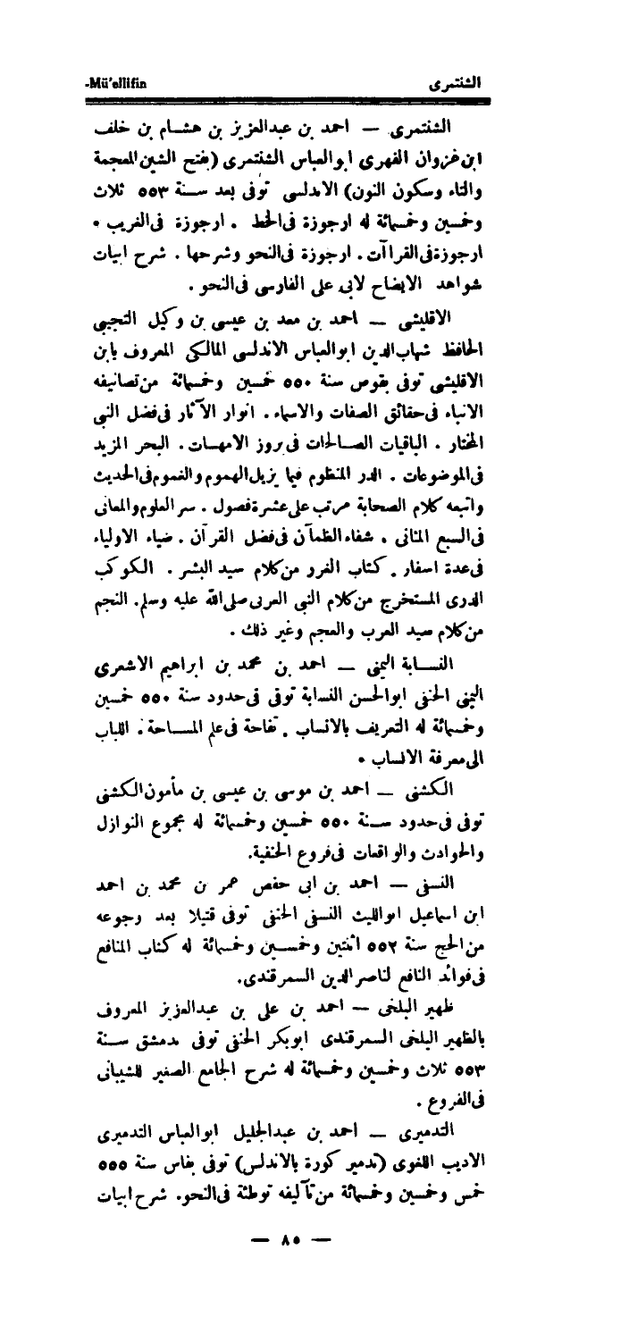الاقليشى - احْمَد بن معد بن عِيسَى بن وَكيل التجيبى الْحَافِظ شهَاب الدَّين أَبُو الْعَبَّاس الاندلسي المالكى الْمَعْرُوف بِابْن الاقليشى توفى بقوس سنة 550 خمسين وَخَمْسمِائة من تصانيفه الانباء فِي حقائق الصِّفَات والاسماء.