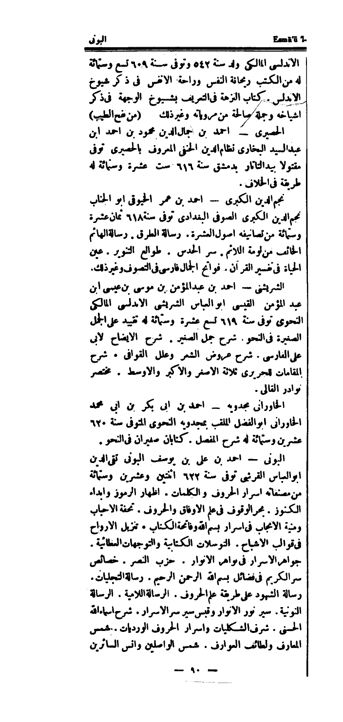 البونى - احْمَد بن على بن يُوسُف البونى تقى الدَّين أَبُو الْعَبَّاس القرشى توفى سنة 622 اثْنَتَيْنِ وَعشْرين وسِتمِائَة من مصنفاته اسرار الْحُرُوف والكلمات.