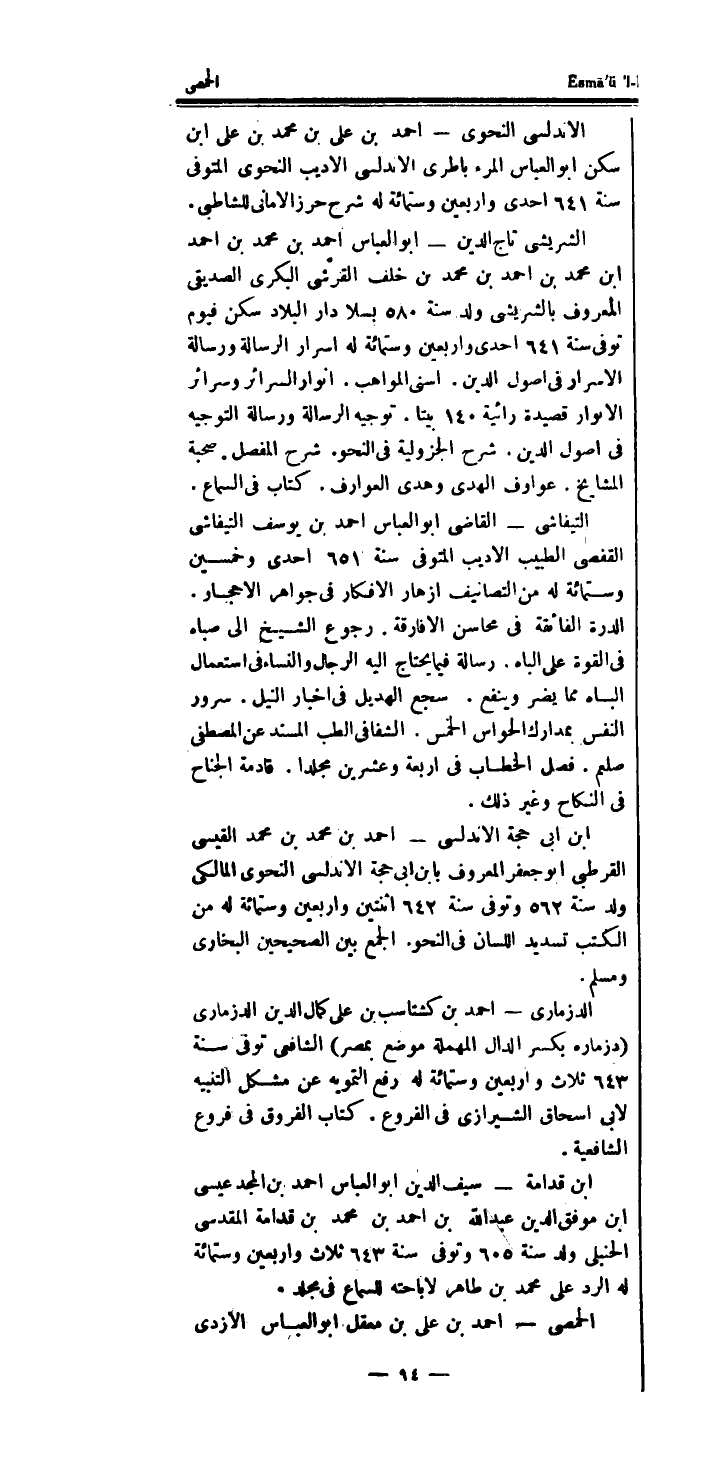 ابْن قدامَة - سيف الدَّين أَبُو الْعَبَّاس احْمَد بن الْمجد عِيسَى ابْن موفق الدَّين عبد الله بن احْمَد بن مُحَمَّد بن قدامَة الْمَقْدِسِي الحنبلى ولد سنة 605 وَتوفى سنة 643 ثَلَاث واربعين وسِتمِائَة لَهُ الرَّد على مُحَمَّد بن طَاهِر لاباحته للسماع فِي مُجَلد.