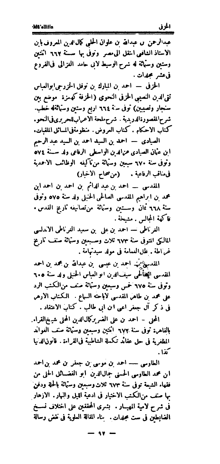 الْمحلى - احْمَد بن على الضَّرِير كَمَال الدَّين الْمحلى شيخ الْقُرَّاء بِالْقَاهِرَةِ توفى سنة 672 اثْنَتَيْنِ وَسبعين وسِتمِائَة صنف الْفَوَائِد المظفرية فِي حل عقائد تَكْمِلَة الشاطبية فِي الْقِرَاءَة.