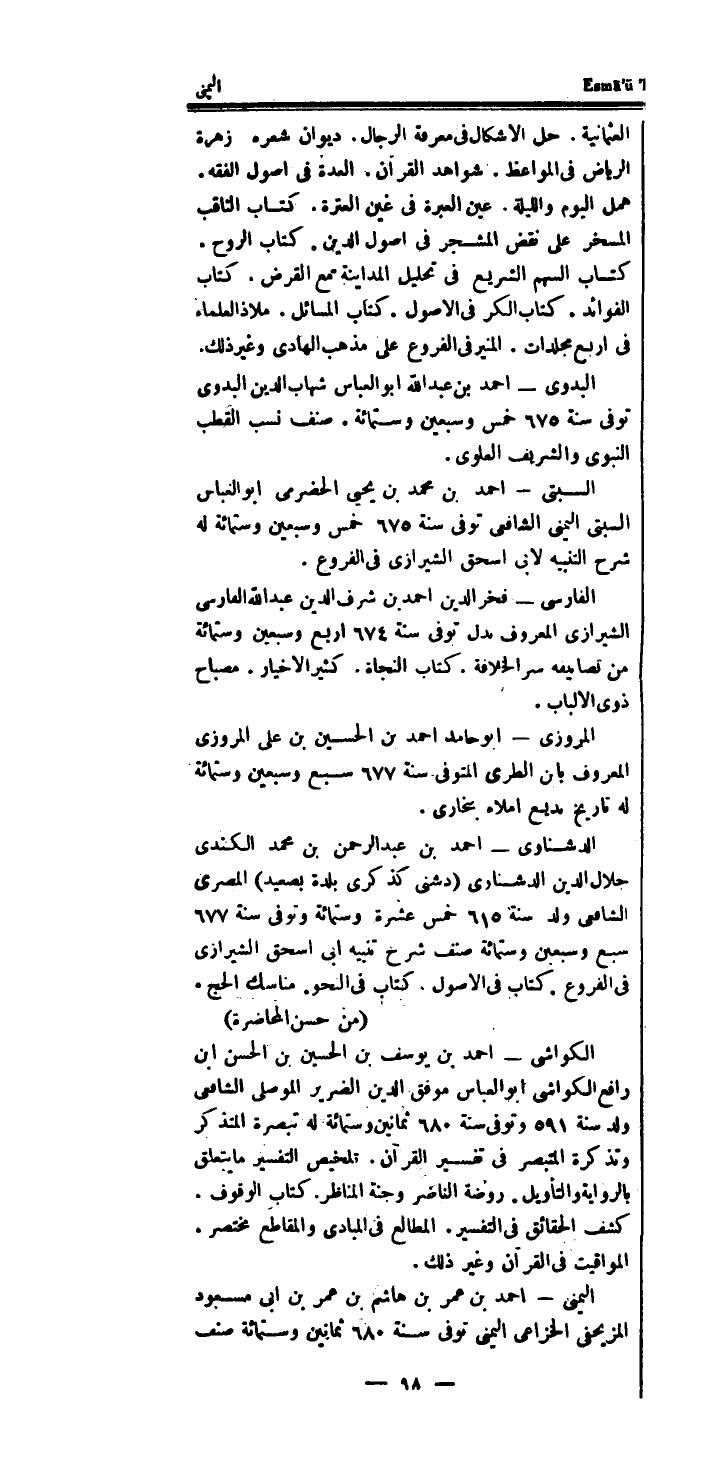 الْيُمْنَى - احْمَد بن عمر بن هَاشم بن عمر بن ابى مَسْعُود المزيحفى الخزاعى الْيُمْنَى توفى سنة 680 ثَمَانِينَ وسِتمِائَة صنف
