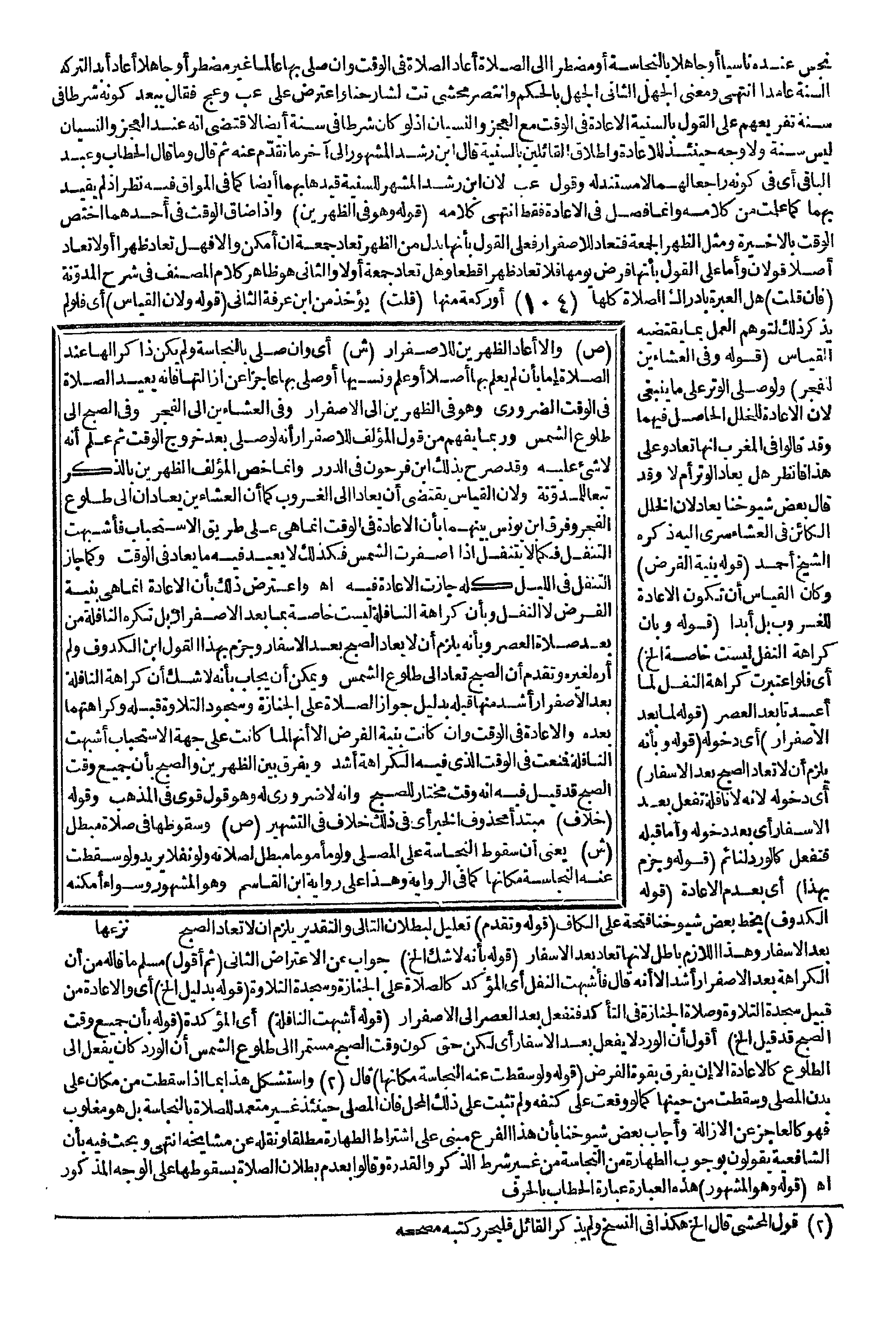 قَالَ ابْنُ رُشْدٍ الْمَشْهُورُ إلَى آخِرِ مَا تَقَدَّمَ عَنْهُ، ثُمَّ قَالَ وَمَا قَالَ الْحَطَّابُ وَعَبْدُ الْبَاقِي أَيْ فِي كَوْنِهِ رَاجِعًا لَهُمَا لَا مُسْتَنَدَ لَهُ وَقَوْلُ عب؛ لِأَنَّ ابْنَ رُشْدٍ الْمُشَهِّرَ لِلسُّنِّيَّةِ قَيَّدَهَا بِهِمَا أَيْضًا كَمَا فِي الْمَوَّاقِ فِيهِ نَظَرٌ إذْ لَمْ يُقَيِّدْ بِهِمَا كَمَا عَلِمْت مِنْ كَلَامِهِ وَإِنَّمَا فَصَّلَ فِي الْإِعَادَةِ فَقَطْ انْتَهَى كَلَامُهُ.