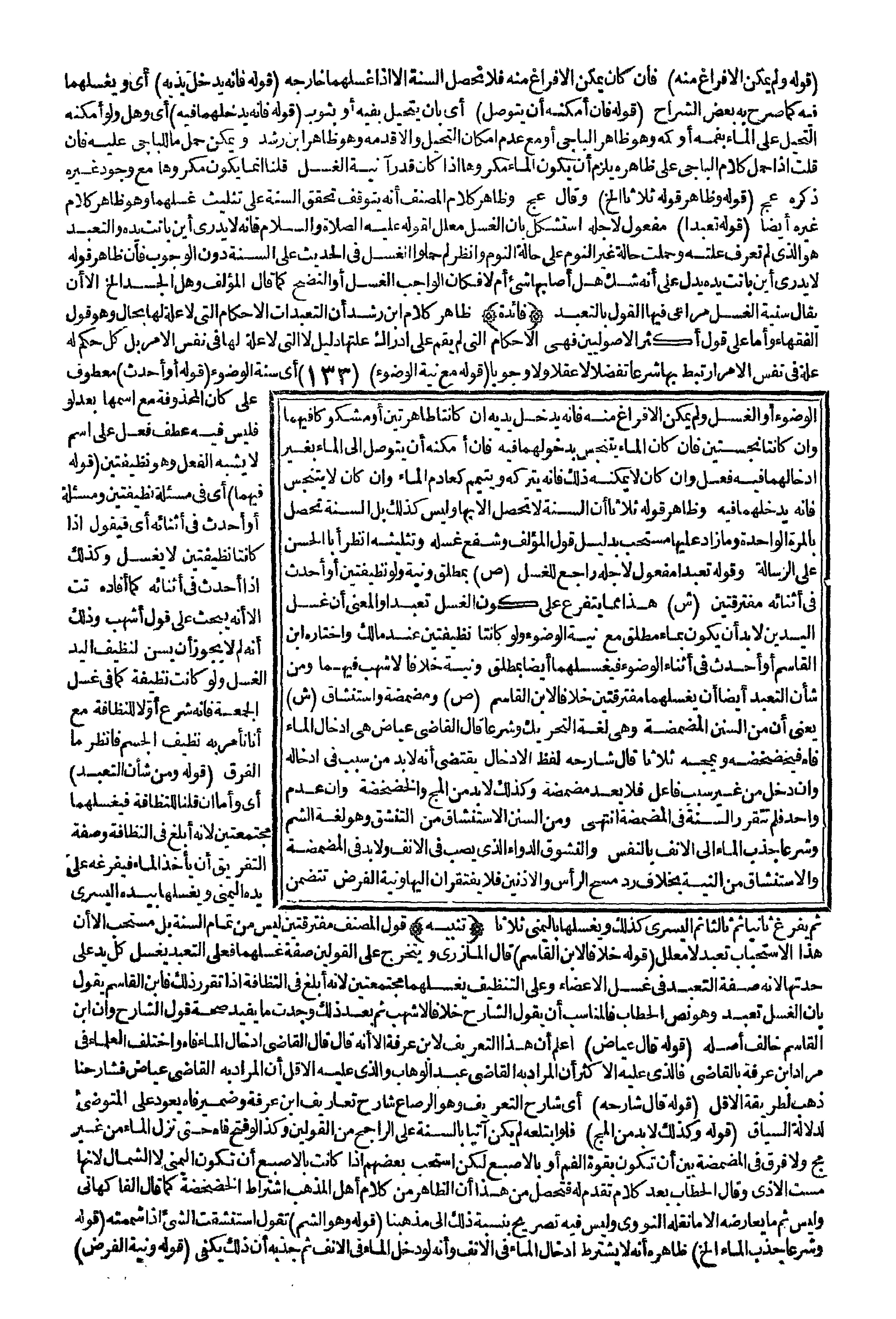 (فَائِدَةٌ) ظَاهِرُ كَلَامِ ابْنِ رُشْدٍ أَنَّ التَّعَبُّدَاتِ الْأَحْكَامُ الَّتِي لَا عِلَّةَ لَهَا بِحَالٍ وَهُوَ قَوْلُ الْفُقَهَاءِ، وَأَمَّا عَلَى قَوْلِ أَكْثَرِ الْأُصُولِيِّينَ فَهِيَ الْأَحْكَامُ الَّتِي لَمْ يَقُمْ عَلَى إدْرَاكِ عِلَّتِهَا دَلِيلٌ لَا الَّتِي لَا عِلَّةَ لَهَا فِي نَفْسِ الْأَمْرِ بَلْ كُلُّ حُكْمٍ لَهُ عِلَّةٌ فِي نَفْسِ الْأَمْرِ ارْتَبَطَ بِهَا شَرْعًا تَفَضُّلًا لَا عَقْلًا وَلَا وُجُوبًا (قَوْلُهُ: مَعَ نِيَّةِ الْوُضُوءِ) أَيْ سُنَّةِ الْوُضُوءِ (قَوْلُهُ: أَوْ أَحْدَثَ) مَعْطُوفٌ عَلَى كَانَ الْمَحْذُوفَةِ مَعَ اسْمِهَا بَعْدَ لَوْ فَلَيْسَ فِيهِ عَطْفُ فِعْلٍ عَلَى اسْمٍ لَا يُشْبِهُ الْفِعْلَ وَهُوَ نَظِيفَتَيْنِ (قَوْلُهُ: فِيهِمَا) أَيْ فِي مَسْأَلَةِ نَظِيفَتَيْنِ وَمَسْأَلَةِ أَوْ أَحْدَثَ فِي أَثْنَائِهِ أَيْ فَيَقُولُ إذَا كَانَتَا نَظِيفَتَيْنِ لَا يَغْسِلُ وَكَذَلِكَ إذَا أَحْدَثَ فِي أَثْنَائِهِ كَمَا أَفَادَهُ تت إلَّا أَنَّهُ يُبْحَثُ عَلَى قَوْلِ أَشْهَبَ وَذَلِكَ أَنَّهُ لِمَ لَا يَجُوزُ أَنْ يُسَنَّ لِتَنْظِيفِ الْيَدِ الْغَسْلُ وَلَوْ كَانَتْ نَظِيفَةً كَمَا فِي غُسْلِ الْجُمُعَةِ، فَإِنَّهُ شُرِعَ أَوَّلًا لِلنَّظَافَةِ مَعَ أَنَّا نَأْمُرُ بِهِ نَظِيفَ الْجَسَدِ فَانْظُرْ مَا الْفَرْقُ (قَوْلُهُ: وَمِنْ شَأْنِ التَّعَبُّدِ) أَيْ، وَأَمَّا إنْ قُلْنَا: لِلنَّظَافَةِ فَيَغْسِلُهُمَا مُجْتَمِعَتَيْنِ؛ لِأَنَّهُ أَبْلَغُ فِي النَّظَافَةِ، وَصِفَةُ التَّفْرِيقِ أَنْ يَأْخُذَ الْمَاءَ فَيُفْرِغَهُ عَلَى يَدِهِ الْيُمْنَى وَيَغْسِلَهَا بِيَدِهِ الْيُسْرَى ثُمَّ يُفْرِغَ ثَانِيًا ثُمَّ ثَالِثًا ثُمَّ الْيُسْرَى كَذَلِكَ وَيَغْسِلَهَا بِالْيُمْنَى ثَلَاثًا.