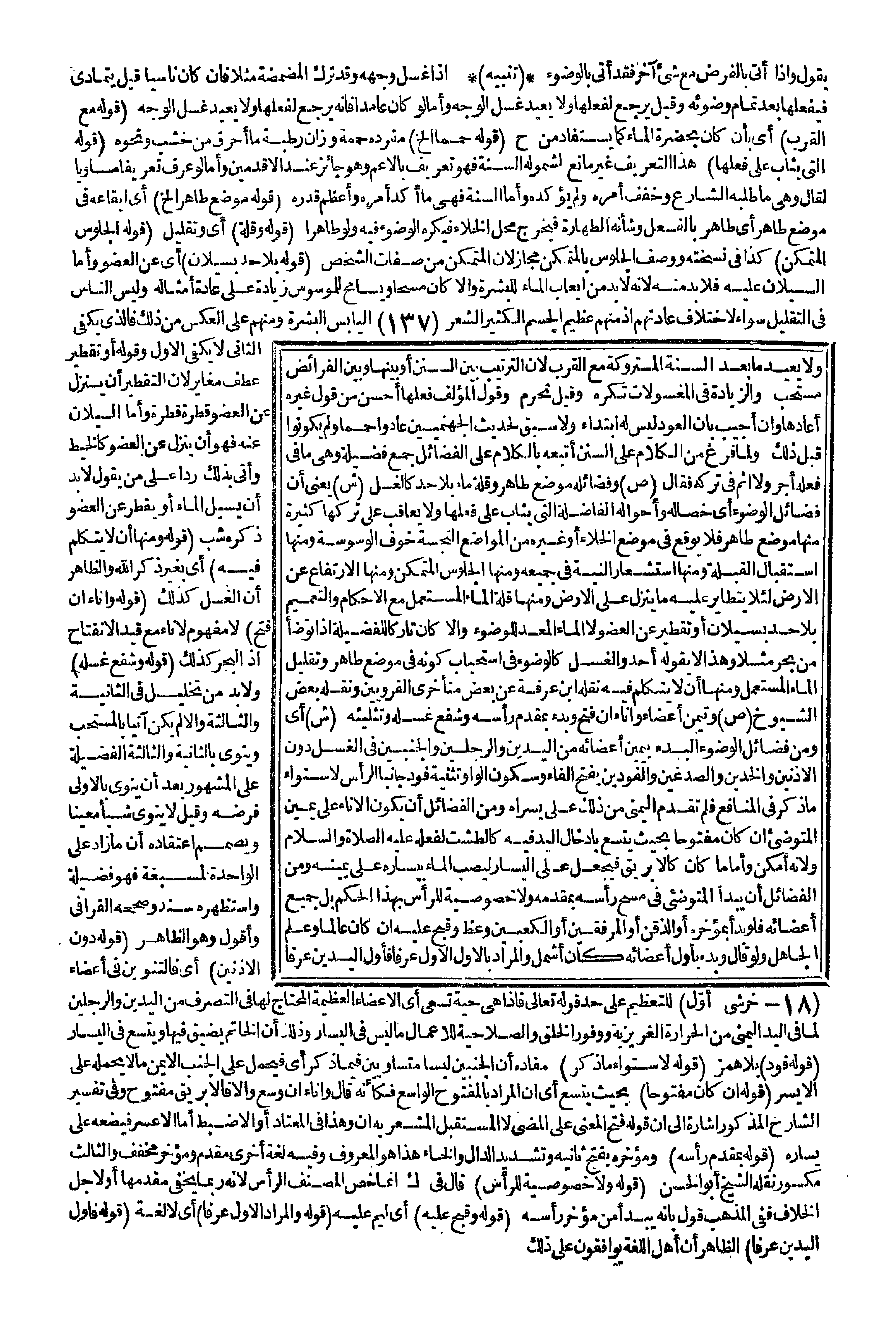 (قَوْلُهُ: الَّتِي يُثَابُ عَلَى فِعْلِهَا) هَذَا التَّعْرِيفُ غَيْرُ مَانِعٍ لِشُمُولِهِ السُّنَّةَ فَهُوَ تَعْرِيفٌ بِالْأَعَمِّ وَهُوَ جَائِزٌ عِنْدَ الْأَقْدَمِينَ، وَأَمَّا لَوْ عَرَّفَ تَعْرِيفًا مُسَاوِيًا لَقَالَ وَهِيَ مَا طَلَبَهُ الشَّارِعُ وَخَفَّفَ أَمْرَهُ وَلَمْ يُؤَكِّدْهُ، وَأَمَّا السُّنَّةُ فَهِيَ مَا أُكِّدَ أَمْرُهُ وَأُعْظِمَ قَدْرُهُ (قَوْلُهُ: مَوْضِعٌ طَاهِرٌ إلَخْ) أَيْ إيقَاعُهُ فِي مَوْضِعٍ طَاهِرٍ أَيْ طَاهِرٍ بِالْفِعْلِ وَشَأْنُهُ الطَّهَارَةُ فَيَخْرُجُ مَحَلُّ الْخَلَاءِ فَيُكْرَهُ الْوُضُوءُ فِيهِ وَلَوْ طَاهِرًا (قَوْلُهُ: وَقِلَّةُ) أَيْ وَتَقْلِيلُ (قَوْلُهُ: الْجُلُوسُ الْمُتَمَكِّنُ) كَذَا فِي نُسْخَتِهِ وَوَصْفُ الْجُلُوسِ بِالْمُتَمَكِّنِ مَجَازٌ؛ لِأَنَّ الْمُتَمَكِّنَ مِنْ صِفَاتِ الشَّخْصِ (قَوْلُهُ: بِلَا حَدٍّ بِسَيَلَانٍ) أَيْ عَنْ الْعُضْوِ، وَأَمَّا السَّيَلَانُ عَلَيْهِ فَلَا بُدَّ مِنْهُ؛ لِأَنَّهُ لَا بُدَّ مِنْ إيعَابِ الْمَاءِ لِلْبَشَرَةِ وَإِلَّا كَانَ مَسْحًا وَيُسَامَحُ لِلْمُوَسْوِسِ زِيَادَةً عَلَى عَادَةِ أَمْثَالِهِ وَلَيْسَ النَّاسُ فِي التَّقْلِيلِ سَوَاءً لِاخْتِلَافِ عَادَتِهِمْ إذْ مِنْهُمْ عَظِيمُ الْجِسْمِ الْكَثِيرُ الشَّعْرِ الْيَابِسُ الْبَشَرَةِ وَمِنْهُمْ عَلَى الْعَكْسِ مِنْ ذَلِكَ فَاَلَّذِي يَكْفِي الثَّانِيَ لَا يَكْفِي الْأَوَّلَ وَقَوْلُهُ أَوْ تَقْطِيرٍ عَطْفٌ مُغَايِرٍ؛ لِأَنَّ التَّقْطِيرَ أَنْ يَنْزِلَ عَنْ الْعُضْوِ قَطْرَةً قَطْرَةً، وَأَمَّا السَّيَلَانُ عَنْهُ فَهُوَ أَنْ يَنْزِلَ عَنْ الْعُضْوِ كَالْخَيْطِ وَأَتَى بِذَلِكَ رَدًّا عَلَى مَنْ يَقُولُ لَا بُدَّ أَنْ يَسِيلَ الْمَاءُ أَوْ يَقْطُرَ عَنْ الْعُضْوِ ذَكَرَهُ شب (قَوْلُهُ: وَمِنْهَا أَنْ لَا يَتَكَلَّمَ فِيهِ) أَيْ بِغَيْرِ ذِكْرِ اللَّهِ وَالظَّاهِرُ أَنَّ الْغُسْلَ كَذَلِكَ.