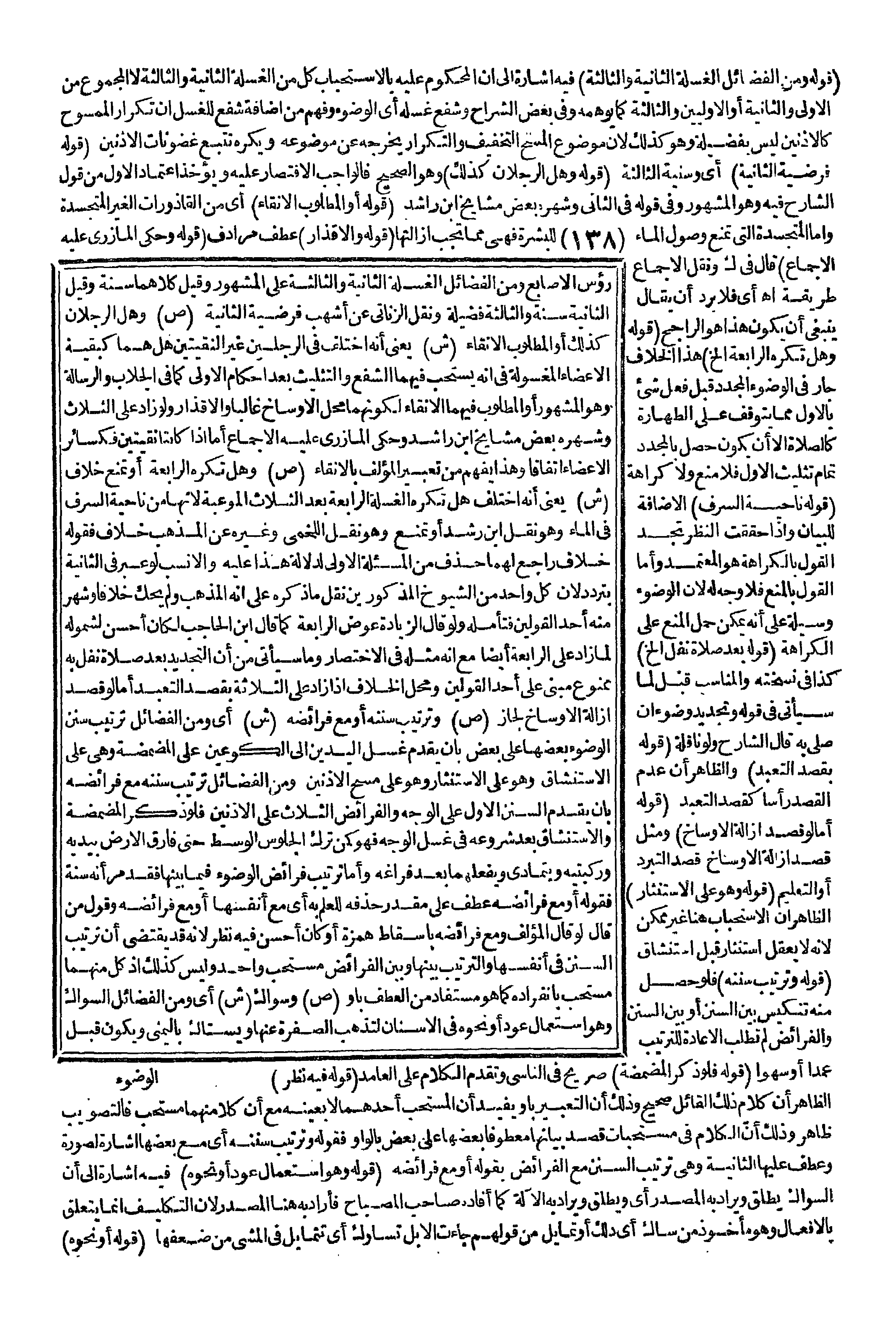 ـــــــــــــــــــــــــــــQقَوْلُهُ: وَمِنْ الْفَضَائِلِ الْغَسْلَةُ الثَّانِيَةُ وَالثَّالِثَةُ) فِيهِ إشَارَةٌ إلَى أَنَّ الْمَحْكُومَ عَلَيْهِ بِالِاسْتِحْبَابِ كُلٌّ مِنْ الْغَسْلَةِ الثَّانِيَةِ وَالثَّالِثَةِ لَا الْمَجْمُوعُ مِنْ الْأُولَى وَالثَّانِيَةِ أَوْ الْأُولَيَيْنِ وَالثَّالِثَةِ كَمَا يُوهِمُهُ وَفِي بَعْضِ الشُّرَّاحِ وَشَفْعَ غَسْلِهِ أَيْ الْوُضُوءُ وَفُهِمَ مِنْ إضَافَةِ شَفْعَ لِلْغَسْلِ أَنَّ تَكْرَارَ الْمَمْسُوحِ كَالْأُذُنَيْنِ لَيْسَ بِفَضِيلَةٍ وَهُوَ كَذَلِكَ؛ لِأَنَّ مَوْضُوعَ الْمَسْحِ التَّخْفِيفُ، وَالتَّكْرَارُ يُخْرِجُهُ عَنْ مَوْضُوعِهِ وَيُكْرَهُ تَتَبُّعُ غُضُونَاتِ الْأُذُنَيْنِ (قَوْلُهُ: فَرْضِيَّةَ الثَّانِيَةِ) أَيْ وَسُنِّيَّةَ الثَّالِثَةِ (قَوْلُهُ: وَهَلْ الرِّجْلَانِ كَذَلِكَ) وَهُوَ الصَّحِيحُ فَالْوَاجِبُ الِاقْتِصَارُ عَلَيْهِ وَيُؤْخَذُ اعْتِمَادُ الْأَوَّلِ مِنْ قَوْلِ الشَّارِحِ فِيهِ وَهُوَ الْمَشْهُورُ وَفِي قَوْلِهِ: فِي الثَّانِي وَشَهَرَهُ بَعْضُ مَشَايِخِ ابْنِ رُشْدٍ (قَوْلُهُ: أَوْ الْمَطْلُوبُ الِاتِّقَاءُ) أَيْ مِنْ الْقَاذُورَاتِ الْغَيْرِ الْمُتَجَسِّدَةِ، وَأَمَّا الْمُتَجَسِّدَةُ الَّتِي تَمْنَعُ وُصُولَ الْمَاءِ لِلْبَشَرَةِ فَهِيَ مِمَّا تَجِبُ إزَالَتُهَا.