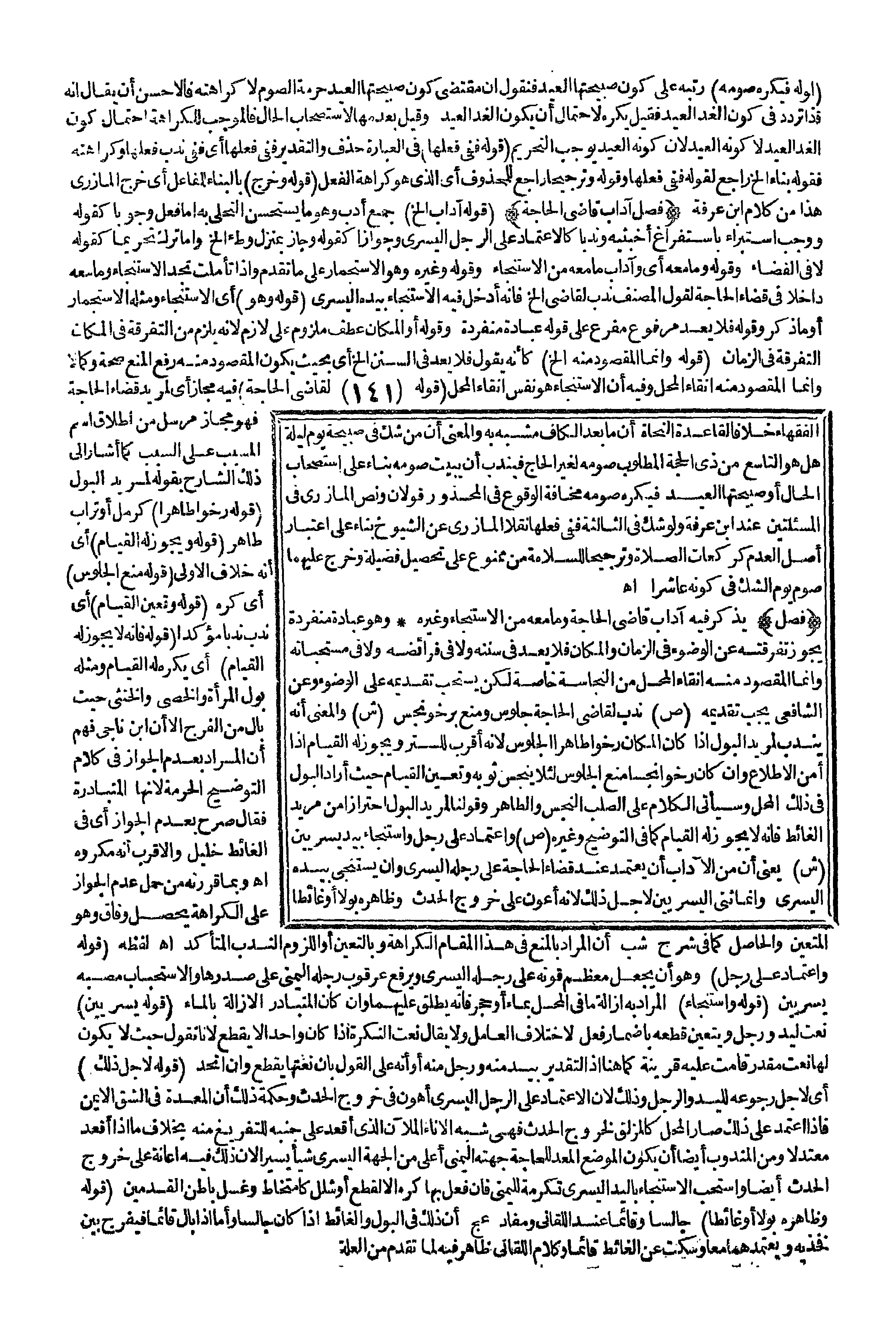 يَذْكُرُ فِيهِ آدَابَ قَاضِي الْحَاجَةِ وَمَا مَعَهُ مِنْ الِاسْتِنْجَاءِ وَغَيْرِهِ وَهُوَ عِبَادَةٌ مُنْفَرِدَةٌ يَجُوزُ تَفْرِقَتُهُ عَنْ الْوُضُوءِ فِي الزَّمَانِ وَالْمَكَانِ فَلَا يُعَدُّ فِي سُنَنِهِ وَلَا فِي فَرَائِضِهِ وَلَا فِي مُسْتَحَبَّاتِهِ، وَإِنَّمَا الْمَقْصُودُ مِنْهُ إنْقَاءُ الْمَحِلِّ مِنْ النَّجَاسَةِ خَاصَّةً لَكِنْ يُسْتَحَبُّ تَقْدِيمُهُ عَلَى الْوُضُوءِ وَعَنْ الشَّافِعِيِّ يَجِبُ تَقْدِيمُهُ (ص) نُدِبَ لِقَاضِي الْحَاجَةِ جُلُوسٌ وَمُنِعَ بِرَخْوٍ نَجِسٍ (ش) وَالْمَعْنَى أَنَّهُ يُنْدَبُ لِمُرِيدِ الْبَوْلِ إذَا كَانَ الْمَكَانُ رَخْوًا طَاهِرًا الْجُلُوسُ لِأَنَّهُ أَقْرَبُ لِلسَّتْرِ وَيَجُوزُ لَهُ الْقِيَامُ إذَا أَمِنَ الِاطِّلَاعَ، وَإِنْ كَانَ رَخْوًا نَجِسًا مُنِعَ الْجُلُوسُ لِئَلَّا يُنَجِّسَ ثَوْبَهُ وَتَعَيَّنَ الْقِيَامُ حَيْثُ أَرَادَ الْبَوْلَ فِي ذَلِكَ الْمَحَلِّ وَسَيَأْتِي الْكَلَامُ عَلَى الصُّلْبِ النَّجِسِ وَالطَّاهِرِ وَقَوْلُنَا: لِمُرِيدِ الْبَوْلَ احْتِرَازٌ مِنْ مُرِيدِ الْغَائِطِ، فَإِنَّهُ لَا يَجُوزُ لَهُ الْقِيَامُ كَمَا فِي التَّوْضِيحِ وَغَيْرِهِ.