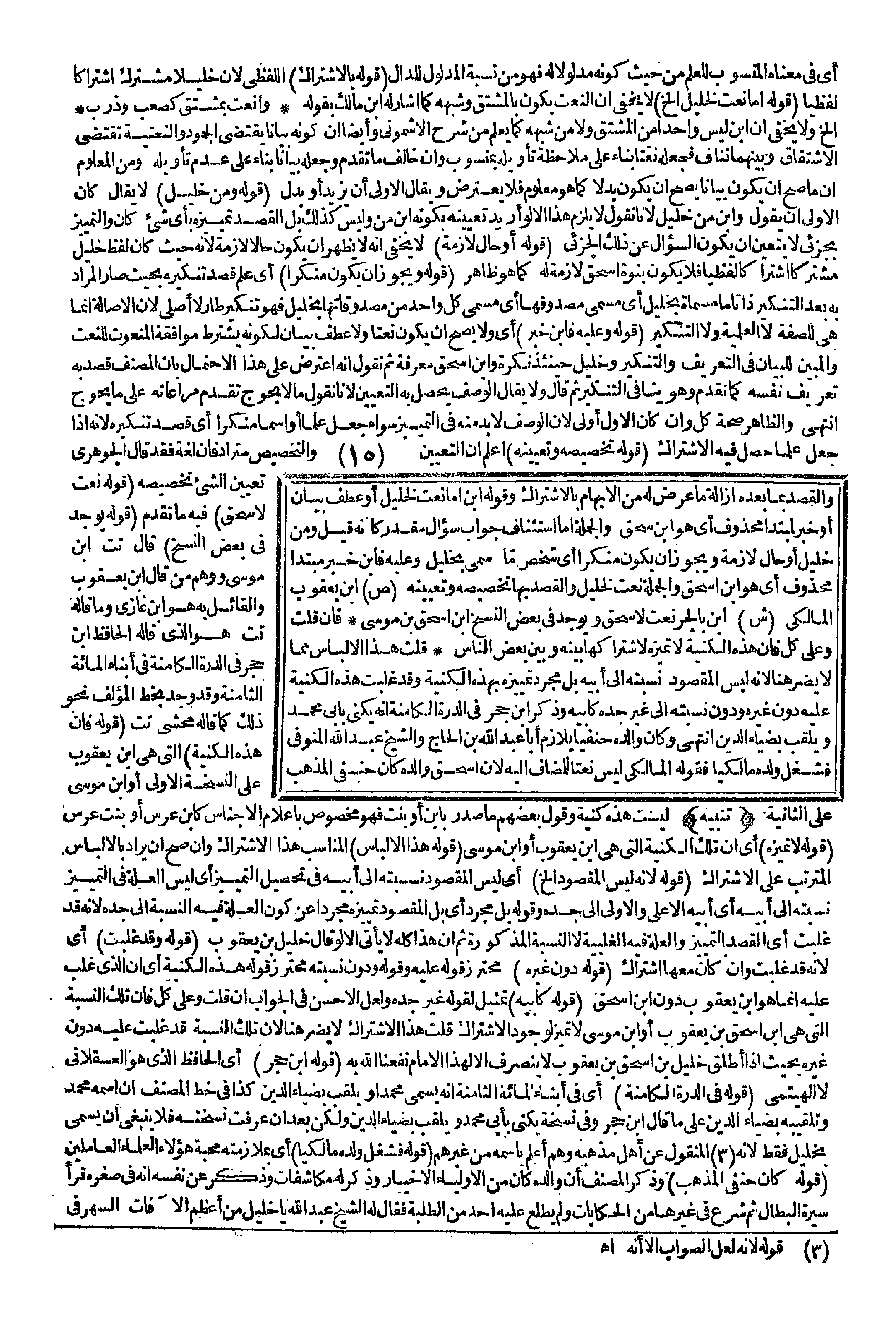 وَالظَّاهِرُ صِحَّةُ كُلٍّ، وَإِنْ كَانَ الْأَوَّلُ أَوْلَى؛ لِأَنَّ الْوَصْفَ لَا بُدَّ مِنْهُ فِي التَّمْيِيزِ سَوَاءُ جُعِلَ عَلَمًا أَوْ اسْمًا مُنَكَّرًا أَيْ قَصَدَ تَنْكِيرَهُ؛ لِأَنَّهُ إذَا جُعِلَ عَلَمًا حَصَلَ فِيهِ الِاشْتِرَاكُ (قَوْلُهُ تَخْصِيصُهُ وَتَعْيِينُهُ) اعْلَمْ أَنَّ التَّعْيِينَ وَالتَّخْصِيصَ مُتَرَادِفَانِ لُغَةً فَقَدْ قَالَ الْجَوْهَرِيُّ تَعْيِينُ الشَّيْءِ تَخْصِيصُهُ (قَوْلُهُ نَعْتٌ لِإِسْحَاقَ) فِيهِ مَا تَقَدَّمَ (قَوْلُهُ يُوجَدُ فِي بَعْضِ النُّسَخِ) قَالَ تت ابْنُ مُوسَى وَوَهَمَ مَنْ قَالَ ابْنُ يَعْقُوبَ وَالْقَائِلُ بِهِ هُوَ ابْنُ غَازِيٍّ وَمَا قَالَهُ تت هُوَ الَّذِي قَالَهُ الْحَافِظُ ابْنُ حَجَرٍ فِي الدُّرَّةِ الْكَامِنَةِ فِي أَبْنَاءِ الْمِائَةِ الثَّامِنَةِ وَقَدْ وُجِدَ بِخَطِّ الْمُؤَلِّفِ نَحْوُ ذَلِكَ كَمَا قَالَهُ مُحَشِّي تت (قَوْلُهُ فَإِنَّ هَذِهِ الْكُنْيَةَ) الَّتِي هِيَ ابْنُ يَعْقُوبَ عَلَى النُّسْخَةِ الْأُولَى أَوْ ابْنُ مُوسَى عَلَى الثَّانِيَةِ.