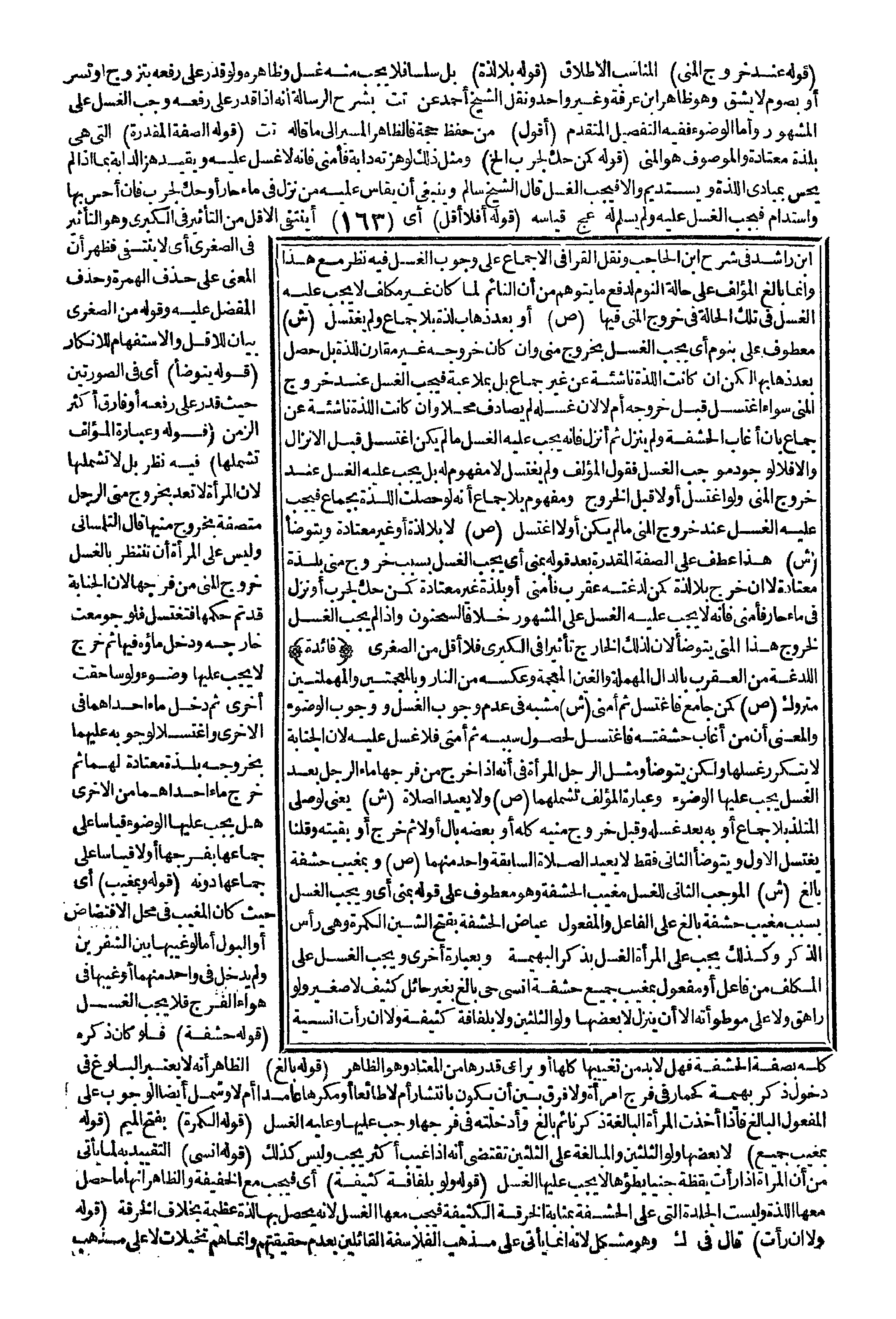 ابْنُ رَاشِدٍ فِي شَرْحِ ابْنِ الْحَاجِبِ وَنَقْلُ الْقَرَافِيِّ الْإِجْمَاعَ عَلَى وُجُوبِ الْغُسْلِ فِيهِ نَظَرٌ مَعَ هَذَا، وَإِنَّمَا بَالَغَ الْمُؤَلِّفُ عَلَى حَالَةِ النَّوْمِ لِدَفْعِ مَا يُتَوَهَّمُ مِنْ أَنَّ النَّائِمَ لَمَّا كَانَ غَيْرَ مُكَلَّفٍ لَا يَجِبُ عَلَيْهِ الْغُسْلُ فِي تِلْكَ الْحَالَةِ فِي خُرُوجِ الْمَنِيِّ فِيهَا.