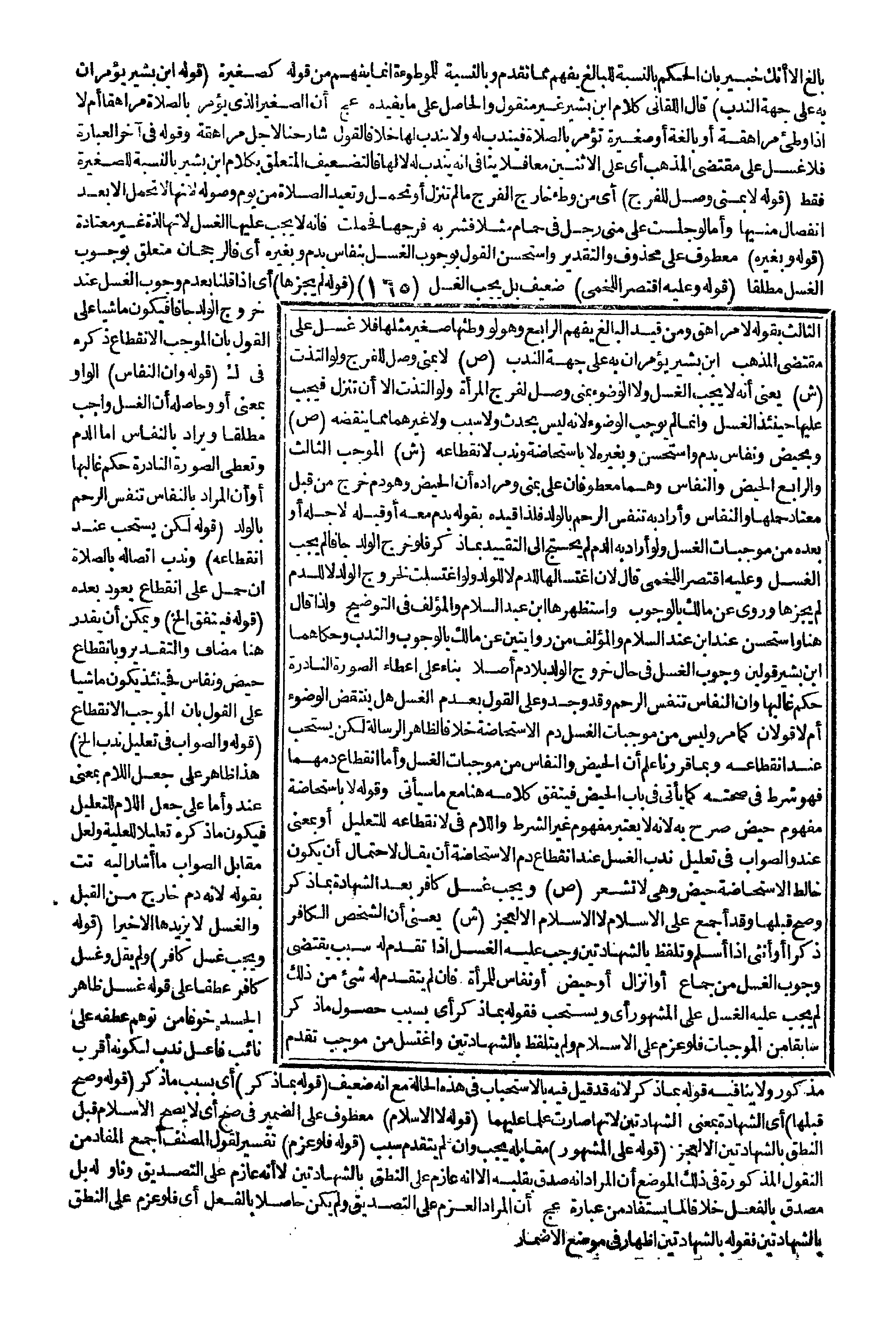 (ص) وَبِحَيْضٍ وَنِفَاسٍ بِدَمٍ وَاسْتُحْسِنَ وَبِغَيْرِهِ لَا بِاسْتِحَاضَةٍ وَنُدِبَ لِانْقِطَاعِهِ (ش) الْمُوجِبُ الثَّالِثُ وَالرَّابِعُ الْحَيْضُ وَالنِّفَاسُ وَهُمَا مَعْطُوفَانِ عَلَى بِمَنِيٍّ وَمُرَادُهُ أَنَّ الْحَيْضَ وَهُوَ دَمٌ خَرَجَ مِنْ قُبُلِ مُعْتَادٍ حَمْلُهَا، وَالنِّفَاسُ وَأَرَادَ بِهِ تَنَفُّسَ الرَّحِمِ بِالْوَلَدِ فَلِذَا قَيَّدَهُ بِقَوْلِهِ بِدَمٍ مَعَهُ أَوْ قَبْلَهُ لِأَجْلِهِ أَوْ بَعْدَهُ مِنْ مُوجِبَاتِ الْغُسْلِ وَلَوْ أَرَادَ بِهِ الدَّمَ لَمْ يَحْتَجْ إلَى التَّقْيِيدِ بِمَا ذَكَرَ فَلَوْ خَرَجَ الْوَلَدُ جَافًّا لَمْ يَجِبْ الْغُسْلُ وَعَلَيْهِ اقْتَصَرَ اللَّخْمِيُّ قَالَ لِأَنَّ اغْتِسَالَهَا لِلدَّمِ لَا لِلْوَلَدِ وَلَوْ اغْتَسَلَتْ لِخُرُوجِ الْوَلَدِ لَا لِلدَّمِ لَمْ يُجْزِهَا وَرُوِيَ عَنْ مَالِكٍ بِالْوُجُوبِ وَاسْتَظْهَرَهَا ابْنُ عَبْدِ السَّلَامِ وَالْمُؤَلِّفُ فِي التَّوْضِيحِ وَلِذَا قَالَ هُنَا وَاسْتُحْسِنَ عِنْدَ ابْنِ عَبْدِ السَّلَامِ وَالْمُؤَلِّفِ مِنْ رِوَايَتَيْنِ عَنْ مَالِكٍ بِالْوُجُوبِ وَالنَّدْبِ وَحَكَاهُمَا ابْنُ بَشِيرٍ قَوْلَيْنِ: وُجُوبُ الْغُسْلِ فِي حَالِ خُرُوجِ الْوَلَدِ بِلَا دَمٍ أَصْلًا بِنَاءً عَلَى إعْطَاءِ الصُّورَةِ النَّادِرَةِ حُكْمَ غَالِبِهَا وَأَنَّ النِّفَاسَ تَنَفُّسُ الرَّحِمِ وَقَدْ وُجِدَ وَعَلَى الْقَوْلِ بِعَدَمِ الْغُسْلِ هَلْ يُنْتَقَضُ الْوُضُوءُ أَمْ لَا قَوْلَانِ كَمَا مَرَّ وَلَيْسَ مِنْ مُوجِبَاتِ الْغُسْلِ دَمُ الِاسْتِحَاضَةِ خِلَافًا لِظَاهِرِ الرِّسَالَةِ لَكِنْ يُسْتَحَبُّ عِنْدَ انْقِطَاعِهِ بِمَا قَرَّرْنَا عُلِمَ أَنَّ الْحَيْضَ وَالنِّفَاسَ مِنْ مُوجِبَاتِ الْغُسْلِ، وَأَمَّا انْقِطَاعُ دَمِهِمَا فَهُوَ شَرْطٌ فِي صِحَّتِهِ كَمَا يَأْتِي فِي بَابِ الْحَيْضِ فَيَتَّفِقُ كَلَامُهُ هُنَا مَعَ مَا سَيَأْتِي وَقَوْلُهُ لَا بِاسْتِحَاضَةٍ مَفْهُومُ حَيْضٍ صَرَّحَ بِهِ لِأَنَّهُ لَا يُعْتَبَرُ مَفْهُومُ غَيْرِ الشَّرْطِ وَاللَّامُ فِي لِانْقِطَاعِهِ لِلتَّعْلِيلِ أَوْ بِمَعْنَى عِنْدَ وَالصَّوَابُ فِي تَعْلِيلِ نَدْبِ الْغُسْلِ عِنْدَ انْقِطَاعِ دَمِ الِاسْتِحَاضَةِ أَنْ يُقَالَ لِاحْتِمَالِ أَنْ يَكُونَ خَالَطَ الِاسْتِحَاضَةَ حَيْضٌ وَلَا تَشْعُرُ.