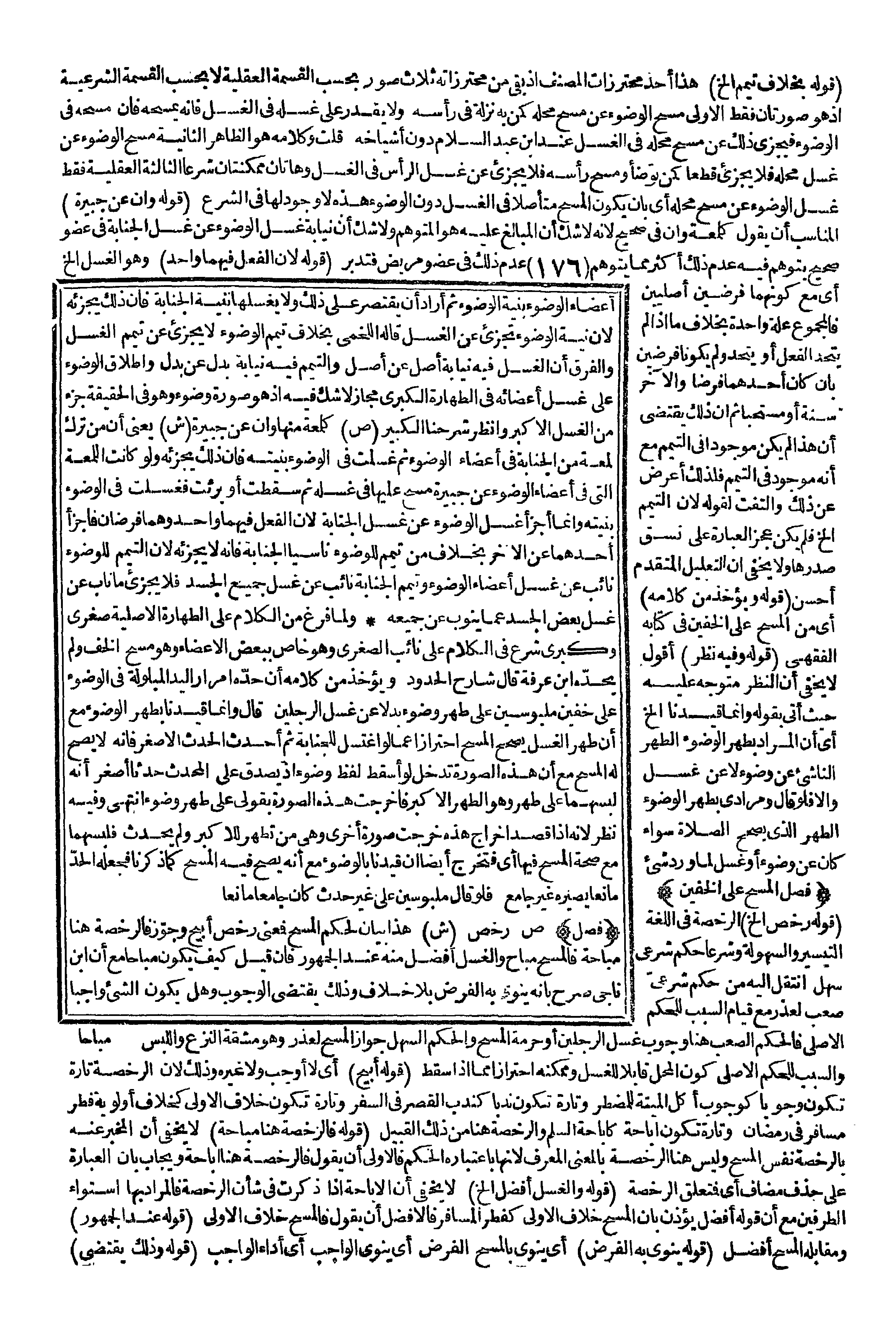 (فَصْلُ الْمَسْحِ عَلَى الْخُفَّيْنِ) (قَوْلُهُ: وَيُؤْخَذُ مِنْ كَلَامِهِ) أَيْ مِنْ الْمَسْحِ عَلَى الْخُفَّيْنِ فِي كِتَابِهِ الْفِقْهِيِّ (قَوْلُهُ وَفِيهِ نَظَرٌ) أَقُولُ لَا يَخْفَى أَنَّ النَّظَرَ مُتَوَجِّهٌ عَلَيْهِ حَيْثُ أَتَى بِقَوْلِهِ، وَإِنَّمَا قَيَّدْنَا إلَخْ أَيْ أَنَّ الْمُرَادَ بِطُهْرِ الْوُضُوءِ الطُّهْرُ النَّاشِئُ عَنْ وُضُوءٍ لَا عَنْ غُسْلٍ وَإِلَّا فَلَوْ قَالَ: وَمُرَادِي بِطُهْرِ الْوُضُوءِ الطُّهْرُ الَّذِي يَصِحُّ الصَّلَاةُ سَوَاءٌ كَانَ عَنْ وُضُوءٍ أَوْ غُسْلٍ لَمَا وَرَدَ شَيْءٌ (قَوْلُهُ رُخِّصَ إلَخْ) الرُّخْصَةُ فِي اللُّغَةِ التَّيْسِيرُ وَالسُّهُولَةُ وَشَرْعًا حُكْمٌ شَرْعِيٌّ سَهْلٌ اُنْتُقِلَ إلَيْهِ مِنْ حُكْمٍ شَرْعِيٍّ صَعْبٍ لِعُذْرٍ مَعَ قِيَامِ السَّبَبِ لِلْحَكَمِ الْأَصْلِيِّ فَالْحُكْمُ الصَّعْبُ هُنَا وُجُوبُ غَسْلِ الرِّجْلَيْنِ أَوْ حُرْمَةُ الْمَسْحِ وَالْحُكْمُ السَّهْلُ جَوَازُ الْمَسْحِ لِعُذْرٍ وَهُوَ مَشَقَّةُ النَّزْعِ وَاللُّبْسِ وَالسَّبَبُ لِلْحَكَمِ الْأَصْلِيِّ كَوْنُ الْمَحَلِّ قَابِلًا لِلْغَسْلِ وَمُمْكِنَهُ احْتِرَازًا مِمَّا إذَا سَقَطَ (قَوْلُهُ: أُبِيحَ) أَيْ لَا أُوجِبَ وَلَا غَيْرُهُ وَذَلِكَ لِأَنَّ الرُّخْصَةَ تَارَةً تَكُونُ وُجُوبًا كَوُجُوبِ أَكْلِ الْمَيْتَةِ لِلْمُضْطَرِّ وَتَارَةً تَكُونُ نَدْبًا كَنَدْبِ الْقَصْرِ فِي السَّفَرِ وَتَارَةً تَكُونُ خِلَافَ الْأَوْلَى كَخِلَافِ أَوْلَوِيَّةِ فِطْرِ مُسَافِرٍ فِي رَمَضَانَ وَتَارَةً تَكُونُ إبَاحَةً كَإِبَاحَةِ السَّلَمِ وَالرُّخْصَةُ هُنَا مِنْ ذَلِكَ الْقَبِيلِ (قَوْلُهُ: فَالرُّخْصَةُ هُنَا مُبَاحَةٌ) لَا يَخْفَى أَنَّ الْمُخْبَرَ عَنْهُ بِالرُّخْصِ نَفْسُ الْمَسْحِ وَلَيْسَ هُنَا الرُّخْصَةُ بِالْمَعْنَى الْمُعَرَّفِ لِأَنَّهَا بِاعْتِبَارِهِ الْحُكْمَ فَالْأَوْلَى أَنْ يَقُولَ فَالرُّخْصَةُ هُنَا إبَاحَةٌ وَيُجَابُ بِأَنَّ الْعِبَارَةَ عَلَى حَذْفِ مُضَافٍ أَيْ فَمُتَعَلَّقُ الرُّخْصَةِ (قَوْلُهُ: وَالْغَسْلُ أَفْضَلُ إلَخْ) لَا يَخْفَى أَنَّ الْإِبَاحَةَ إذَا ذُكِرَتْ فِي شَأْنِ الرُّخْصَةِ فَالْمُرَادُ بِهَا اسْتِوَاءُ الطَّرَفَيْنِ مَعَ أَنَّ قَوْلَهُ: أَفْضَلُ يُؤْذِنُ بِأَنَّ الْمَسْحَ خِلَافُ الْأَوْلَى كَفِطْرِ الْمُسَافِرِ فَالْأَفْضَلُ أَنْ يَقُولَ فَالْمَسْحُ خِلَافُ الْأَوْلَى (قَوْلُهُ: عِنْدَ الْجُمْهُورِ) وَمُقَابِلُهُ الْمَسْحُ أَفْضَلُ (قَوْلُهُ: يَنْوِي بِهِ الْفَرْضَ) أَيْ يَنْوِي بِالْمَسْحِ الْفَرْضَ أَيْ يَنْوِي الْوَاجِبَ أَيْ أَدَاءَ الْوَاجِبِ (قَوْلُهُ: وَذَلِكَ يَقْتَضِي)