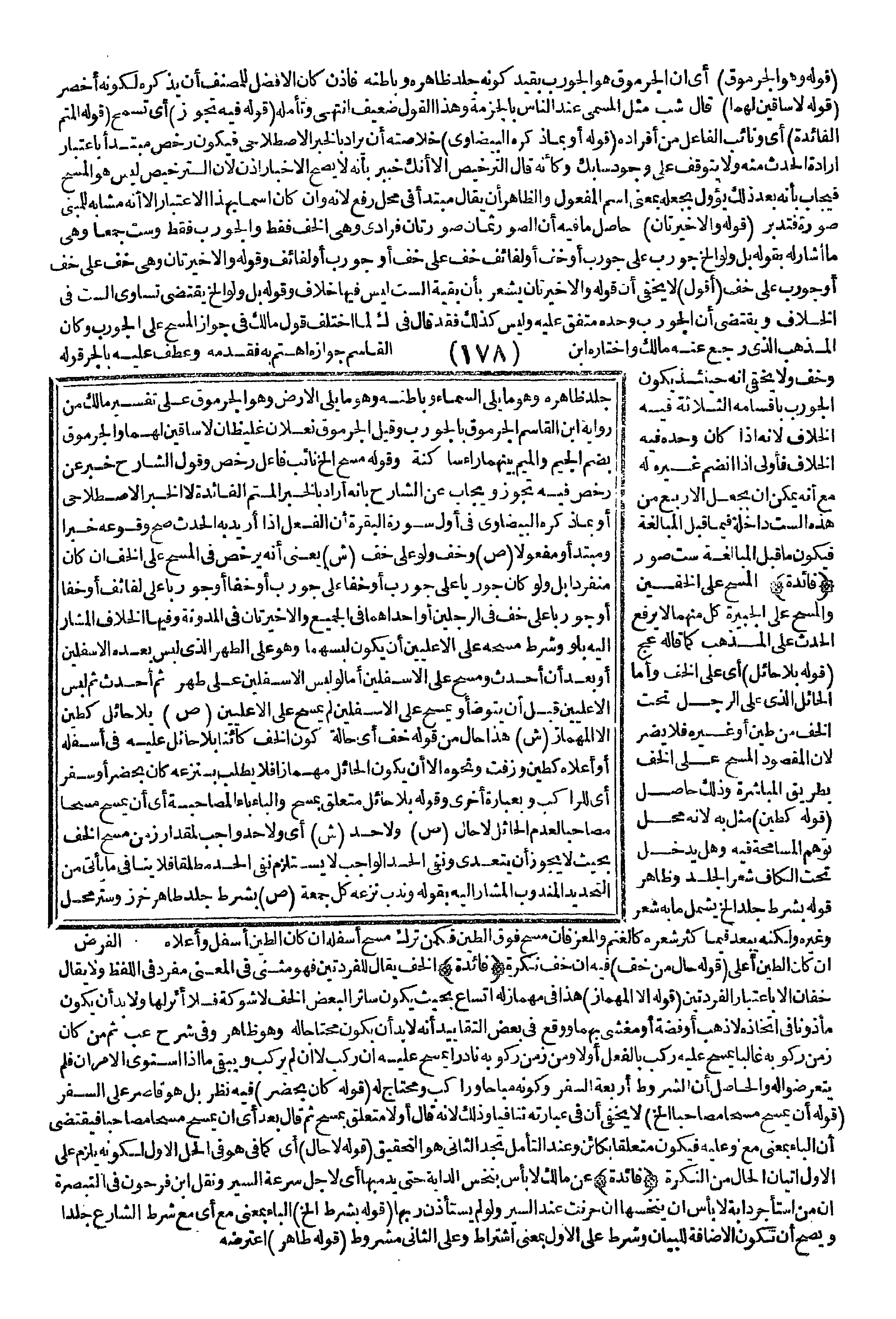 جِلْدُ ظَاهِرِهِ وَهُوَ مَا يَلِي السَّمَاءَ وَبَاطِنِهِ وَهُوَ مَا يَلِي الْأَرْضَ وَهُوَ الْجُرْمُوقُ عَلَى تَفْسِيرِ مَالِكٍ مِنْ رِوَايَةِ ابْنِ الْقَاسِمِ الْجُرْمُوقُ بِالْجَوْرَبِ وَقِيلَ الْجُرْمُوقُ نَعْلَانِ غَلِيظَانِ لَا سَاقَيْنِ لَهُمَا وَالْجُرْمُوقُ بِضَمِّ الْجِيمِ وَالْمِيمِ بَيْنَهُمَا رَاءٌ سَاكِنَةٌ وَقَوْلُهُ مَسْحُ إلَخْ نَائِبُ فَاعِلِ رُخِّصَ وَقَوْلُ الشَّارِحِ خَبَرٌ عَنْ رُخِّصَ فِيهِ تَجَوُّزٌ وَيُجَابُ عَنْ الشَّارِحِ بِأَنَّهُ أَرَادَ بِالْخَبَرِ الْمُتِمَّ الْفَائِدَةَ لَا الْخَبَرَ الِاصْطِلَاحِيَّ أَوْ بِمَا ذَكَرَهُ الْبَيْضَاوِيُّ فِي أَوَّلِ سُورَةِ الْبَقَرَةِ أَنَّ الْفِعْلَ إذَا أُرِيدَ بِهِ الْحَدَثُ صَحَّ وُقُوعُهُ خَبَرًا وَمُبْتَدَأً وَمَفْعُولًا.