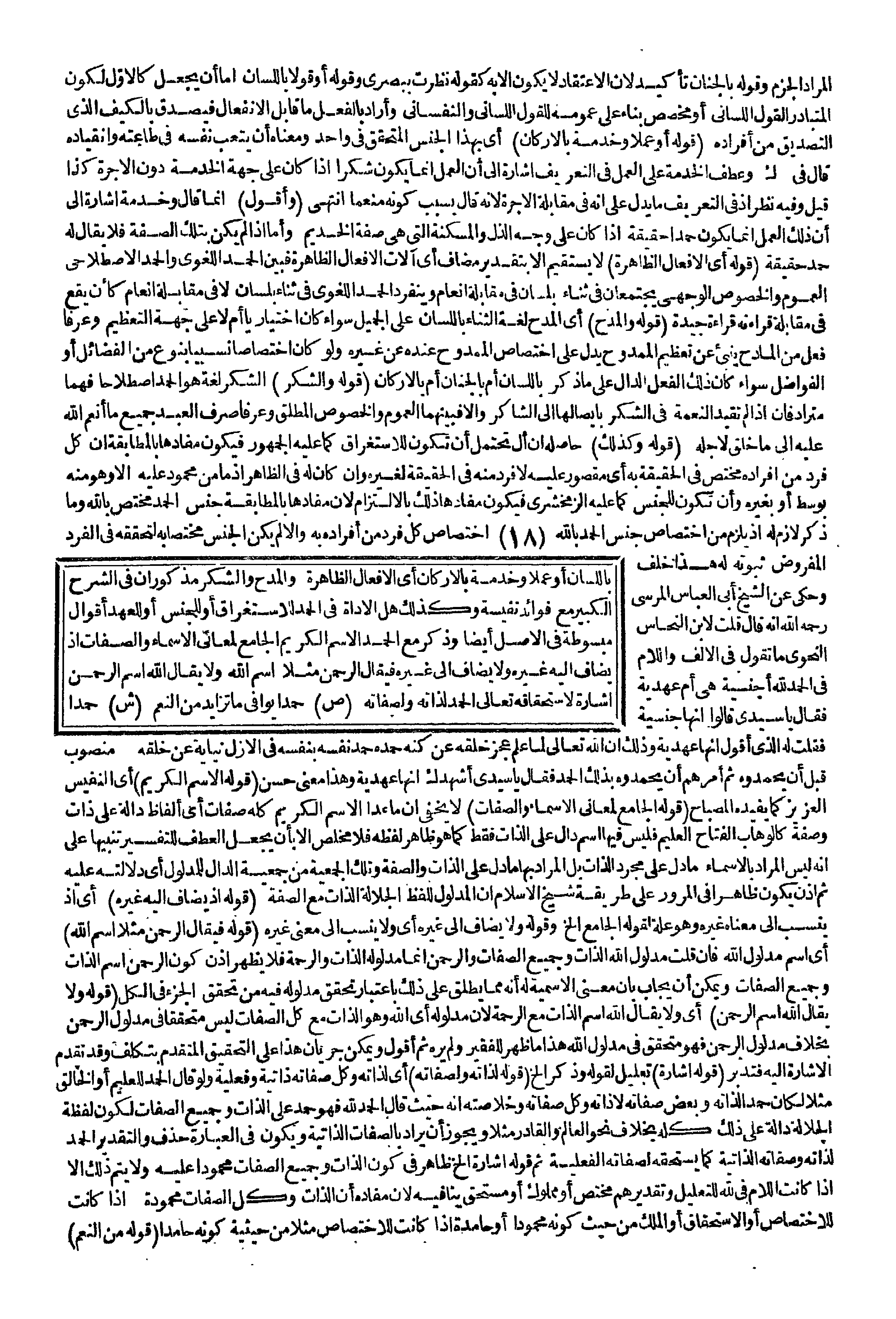 (قَوْلُهُ وَالشُّكْرُ) الشُّكْرُ لُغَةً هُوَ الْحَمْدُ اصْطِلَاحًا فَهُمَا مُتَرَادِفَانِ إذَا لَمْ تُقَيَّدْ النِّعْمَةُ فِي الشُّكْرِ بِإِيصَالِهَا إلَى الشَّاكِرِ وَإِلَّا فَبَيْنَهُمَا الْعُمُومُ وَالْخُصُوصُ الْمُطْلَقُ وَعُرْفًا صَرْفُ الْعَبْدِ جَمِيعَ مَا أَنْعَمَ اللَّهُ عَلَيْهِ إلَى مَا خُلِقَ لِأَجْلِهِ (قَوْلُهُ وَكَذَلِكَ) حَاصِلُهُ أَنَّ أَلْ تَحْتَمِلُ أَنْ تَكُونَ لِلِاسْتِغْرَاقِ كَمَا عَلَيْهِ الْجُمْهُورُ فَيَكُونُ مُفَادُهَا بِالْمُطَابَقَةِ أَنَّ كُلَّ فَرْدٍ مِنْ أَفْرَادِهِ مُخْتَصٌّ فِي الْحَقِيقَةِ بِهِ أَيْ مَقْصُورٌ عَلَيْهِ لَا فَرْدٌ مِنْهُ فِي الْحَقِيقَةِ لِغَيْرِهِ، وَإِنْ كَانَ لَهُ فِي الظَّاهِرِ إذْ مَا مِنْ مَحْمُودٍ عَلَيْهِ إلَّا، وَهُوَ مِنْهُ بِوَسَطٍ أَوْ بِغَيْرِهِ وَأَنْ تَكُونَ لِلْجِنْسِ كَمَا عَلَيْهِ الزَّمَخْشَرِيُّ فَيَكُونُ مُفَادُهَا ذَلِكَ بِالِالْتِزَامِ؛ لِأَنَّ مُفَادَهَا بِالْمُطَابَقَةِ جِنْسَ الْحَمْدِ مُخْتَصٌّ بِاَللَّهِ وَمَا ذُكِرَ لَازِمٌ لَهُ إذْ يَلْزَمُ مِنْ اخْتِصَاصِ جِنْسِ الْحَمْدِ بِاَللَّهِ اخْتِصَاصُ كُلِّ فَرْدٍ مِنْ أَفْرَادِهِ بِهِ وَإِلَّا لَمْ يَكُنْ الْجِنْسُ مُخْتَصًّا بِهِ لِتَحَقُّقِهِ فِي الْفَرْدِ الْمَفْرُوضِ ثُبُوتُهُ لَهُ هَذَا خَلْفٌ وَحُكِيَ عَنْ الشَّيْخِ أَبِي الْعَبَّاسِ الْمُرْسِيِّ - رَحِمَهُ اللَّهُ - أَنَّهُ قَالَ قُلْت لِابْنِ النَّحَّاسِ النَّحْوِيِّ مَا تَقُولُ فِي الْأَلِفِ وَاللَّامِ فِي الْحَمْدُ لِلَّهِ أَجِنْسِيَّةٌ هِيَ أَمْ عَهْدِيَّةٌ فَقَالَ يَا سَيِّدِي قَالُوا إنَّهَا جِنْسِيَّةٌ فَقُلْت لَهُ الَّذِي أَقُولُ إنَّهَا عَهْدِيَّةٌ وَذَلِكَ أَنَّ اللَّهَ تَعَالَى لَمَّا عَلِمَ عَجْزَ خَلْقِهِ عَنْ كُنْهِ حَمِدَهُ حَمِدَ نَفْسَهُ بِنَفْسِهِ فِي الْأَزَلِ نِيَابَةً عَنْ خَلْقِهِ قَبْلَ أَنْ يَحْمَدُوهُ، ثُمَّ أَمَرَهُمْ أَنْ يَحْمَدُوهُ بِذَلِكَ الْحَمْدِ فَقَالَ يَا سَيِّدِي أُشْهِدُك أَنَّهَا عَهْدِيَّةٌ وَهَذَا مَعْنًى حَسَنٌ. (قَوْلُهُ الِاسْمَ الْكَرِيمَ) أَيْ النَّفِيسَ الْعَزِيزَ كَمَا يُفِيدُهُ الْمِصْبَاحُ (قَوْلُهُ الْجَامِعَ لِمَعَانِي الْأَسْمَاءِ وَالصِّفَاتِ) لَا يَخْفَى أَنَّ مَا عَدَا الِاسْمَ الْكَرِيمَ كُلَّهُ صِفَاتٌ أَيْ أَلْفَاظٍ دَالَّةٍ عَلَى ذَاتٍ وَصِفَةٍ كَالْوَهَّابِ الْفَتَّاحِ الْعَلِيمِ فَلَيْسَ فِيهَا اسْمٌ دَالٌّ عَلَى الذَّاتِ فَقَطْ كَمَا هُوَ ظَاهِرُ لَفْظِهِ فَلَا مُخَلِّصَ إلَّا بِأَنْ يُجْعَلَ الْعَطْفُ لِلتَّفْسِيرِ تَنْبِيهًا عَلَى أَنَّهُ لَيْسَ الْمُرَادَ بِالْأَسْمَاءِ مَا دَلَّ عَلَى مُجَرَّدِ الذَّاتِ بَلْ الْمُرَادُ بِهَا مَا دَلَّ عَلَى الذَّاتِ وَالصِّفَةِ وَتِلْكَ الْجَمْعِيَّةُ مِنْ جَمْعِيَّةِ الدَّالِّ لِلْمَدْلُولِ أَيْ دَلَالَتِهِ عَلَيْهِ، ثُمَّ إذَنْ يَكُونُ ظَاهِرًا فِي الْمُرُورِ عَلَى طَرِيقَةِ شَيْخِ الْإِسْلَامِ أَنَّ الْمَدْلُولَ لِلَفْظِ الْجَلَالَةِ الذَّاتُ مَعَ الصِّفَةِ (قَوْلُهُ إذْ يُضَافُ إلَيْهِ غَيْرُهُ) أَيْ إذْ يُنْسَبُ إلَى مَعْنَاهُ غَيْرُهُ، وَهُوَ عِلَّةٌ لِقَوْلِهِ الْجَامِعَ إلَخْ وَلَا يُضَافُ إلَى غَيْرِهِ أَيْ وَلَا يُنْسَبُ إلَى مَعْنَى غَيْرِهِ (قَوْلُهُ فَيُقَالُ الرَّحْمَنُ مَثَلًا اسْمُ اللَّهِ) أَيْ اسْمُ مَدْلُولِ اللَّهِ، فَإِنْ قُلْت مَدْلُولُ اللَّهِ الذَّاتُ وَجَمِيعُ الصِّفَاتِ وَالرَّحْمَنُ إنَّمَا مَدْلُولُهُ الذَّاتُ وَالرَّحْمَةُ فَلَا يَظْهَرُ إذَنْ كَوْنُ الرَّحْمَنِ اسْمَ الذَّاتِ وَجَمِيعِ الصِّفَاتِ وَيُمْكِنُ أَنْ يُجَابَ بِأَنَّ مَعْنَى الِاسْمِيَّةِ لَهُ أَنَّهُ مِمَّا يُطْلَقُ عَلَى ذَلِكَ بِاعْتِبَارِ تَحَقُّقِ مَدْلُولِهِ فِيه