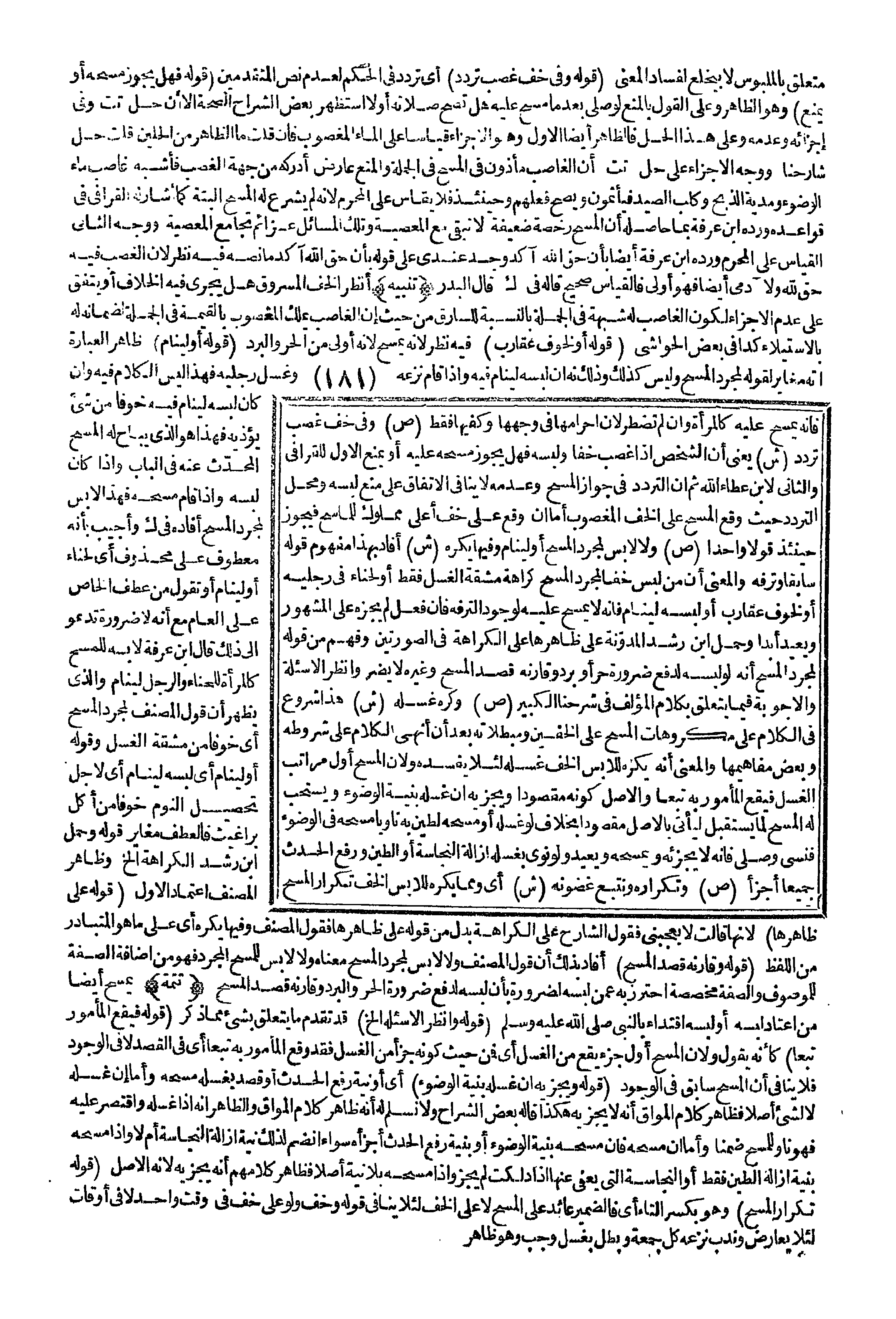 (قَوْلُهُ: وَفِي خُفٍّ غُصِبَ تَرَدُّدٌ) أَيْ تَرَدُّدٌ فِي الْحُكْمِ لِعَدَمِ نَصِّ الْمُتَقَدِّمِينَ (قَوْلُهُ: فَهَلْ يَجُوزُ مَسْحُهُ أَوْ يُمْنَعُ) وَهُوَ الظَّاهِرُ وَعَلَى الْقَوْلِ بِالْمَنْعِ لَوْ صَلَّى بَعْدَ مَا مَسَحَ عَلَيْهِ هَلْ تَصِحُّ صَلَاتُهُ أَوْ لَا اسْتَظْهَرَ بَعْضُ الشُّرَّاحِ الصِّحَّةَ إلَّا أَنَّ حَلَّ تت وَفِي إجْزَائِهِ وَعَدَمِهِ وَعَلَى هَذَا الْحَلِّ فَالظَّاهِرُ أَيْضًا الْأَوَّلُ وَهُوَ الْإِجْزَاءُ قِيَاسًا عَلَى الْمَاءِ الْمَغْصُوبِ فَإِنْ قُلْت مَا الظَّاهِرُ مِنْ الْحَلَّيْنِ قُلْت حَلُّ شَارِحِنَا وَوَجْهُ الْإِجْزَاءِ عَلَى حَلِّ تت أَنَّ الْغَاصِبَ مَأْذُونٌ فِي الْمَسْحِ فِي الْجُمْلَةِ وَالْمَنْعُ عَارِضٌ أَدْرَكَهُ مِنْ جِهَةِ الْغَصْبِ فَأَشْبَهَ غَاصِبَ مَاءِ الْوُضُوءِ وَمُدْيَةِ الذَّبْحِ وَكَلْبِ الصَّيْدِ فَيَأْثَمُونَ وَيَصِحُّ فِعْلُهُمْ وَحِينَئِذٍ فَلَا يُقَاسُ عَلَى الْمُحْرِمِ لِأَنَّهُ لَمْ يُشْرَعْ لَهُ الْمَسْحُ أَلْبَتَّةَ كَمَا أَشَارَ لَهُ الْقَرَافِيُّ فِي قَوَاعِدِهِ وَرَدَّهُ ابْنُ عَرَفَةَ بِمَا حَاصِلُهُ أَنَّ الْمَسْحَ رُخْصَةٌ ضَعِيفَةٌ لَا تَبْقَى مَعَ الْمَعْصِيَةِ وَتِلْكَ الْمَسَائِلُ عَزَائِمُ تُجَامِعُ الْمَعْصِيَةَ وَوَجْهُ الثَّانِي الْقِيَاسُ عَلَى الْمُحْرِمِ وَرَدَّهُ ابْنُ عَرَفَةَ أَيْضًا بِأَنَّ حَقَّ اللَّهِ آكَدُ وُجِدَ عِنْدِي عَلَى قَوْلِهِ بِأَنَّ حَقَّ اللَّهِ آكَدُ مَا نَصُّهُ فِيهِ نَظَرٌ لِأَنَّ الْغَصْبَ فِيهِ حَقٌّ لِلَّهِ وَلِآدَمِيٍّ أَيْضًا فَهُوَ أَوْلَى فَالْقِيَاسُ صَحِيحٌ قَالَهُ فِي ك قَالَ الْبَدْرُ