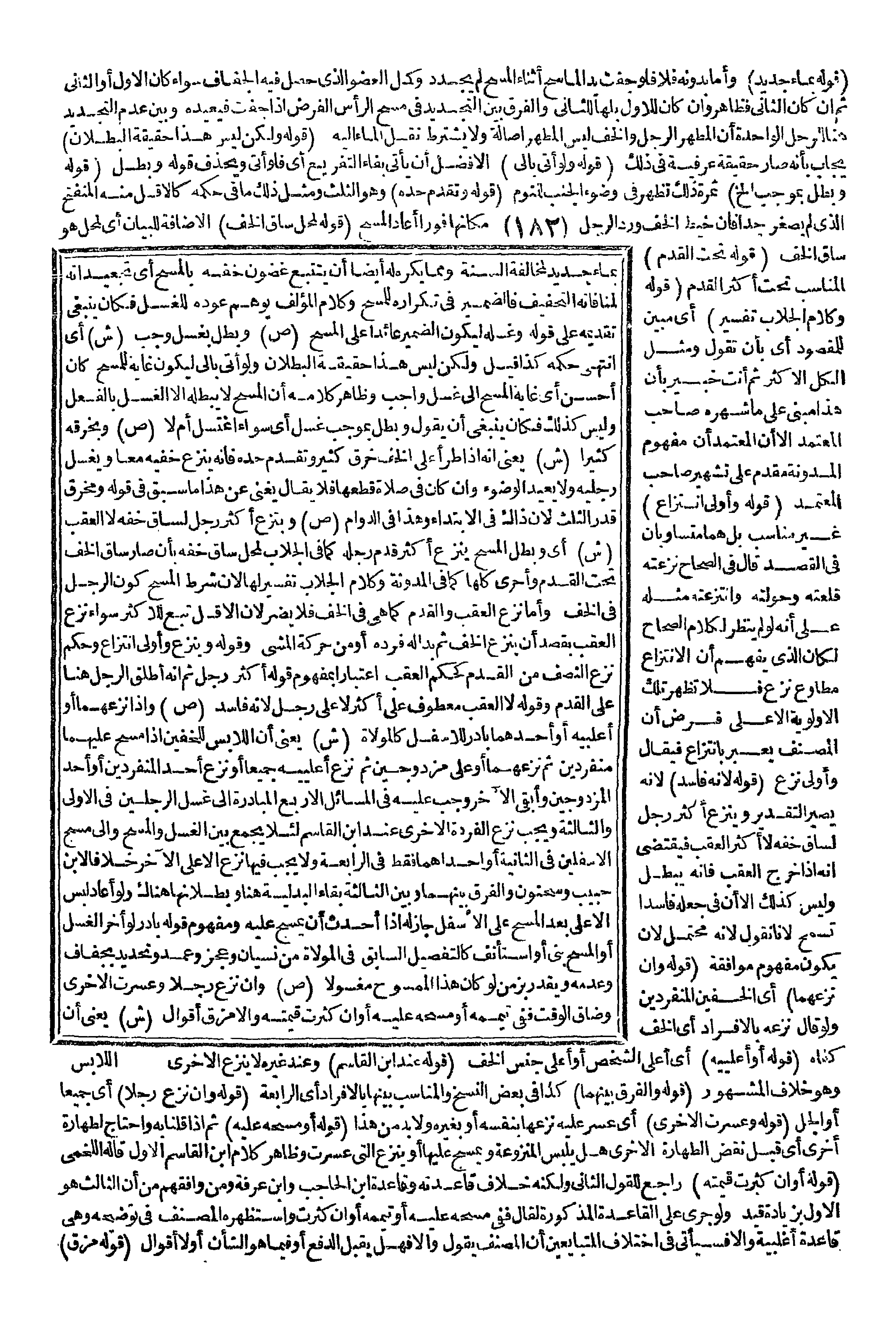(قَوْلُهُ: وَلَكِنْ لَيْسَ هَذَا حَقِيقَةَ الْبُطْلَانِ) يُجَابُ بِأَنَّهُ صَارَ حَقِيقَةً عُرْفِيَّةً فِي ذَلِكَ (قَوْلُهُ: وَلَوْ أَتَى بِإِلَى) الْأَفْضَلُ أَنْ يَأْتِيَ بِفَاءِ التَّفْرِيغِ أَيْ فَلَوْ أَتَى وَيُحْذَفُ قَوْلُهُ وَبَطَلَ (قَوْلُهُ: وَبَطَلَ بِمُوجِبِ إلَخْ) ثَمَرَةُ ذَلِكَ تَظْهَرُ فِي وُضُوءِ الْجُنُبِ لِلنَّوْمِ (قَوْلُهُ: وَتَقَدَّمَ حَدُّهُ) وَهُوَ الثُّلُثُ وَمِثْلُ ذَلِكَ مَا فِي حُكْمِهِ كَالْأَقَلِّ مِنْهُ الْمُنْفَتِحِ الَّذِي لَمْ يُصَغَّرْ جِدًّا فَإِنْ خَيَّطَ الْخُفَّ وَرَدَّ الرِّجْلَ مَكَانَهَا فَوْرًا أَعَادَ الْمَسْحَ (قَوْلُهُ: لِمَحَلِّ سَاقِ الْخُفِّ) الْإِضَافَةُ لِلْبَيَانِ أَيْ لِمَحَلٍّ هُوَ سَاقُ الْخُفِّ (قَوْلُهُ: تَحْتَ الْقَدَمِ) الْمُنَاسِبُ تَحْتَ أَكْثَرِ الْقَدَمِ (قَوْلُهُ: وَكَلَامُ الْجَلَّابِ تَفْسِيرٌ) أَيْ مُبَيِّنٌ لِلْمَقْصُودِ أَيْ بِأَنْ تَقُولَ: وَمِثْلُ الْكُلِّ الْأَكْثَرُ ثُمَّ أَنْتَ خَبِيرٌ بِأَنَّ هَذَا مَبْنِيٌّ عَلَى مَا شَهَرَهُ صَاحِبُ الْمُعْتَمَدِ إلَّا أَنَّ الْمُعْتَمَدَ أَنَّ مَفْهُومَ الْمُدَوَّنَةِ تَقَدَّمَ عَلَى تَشْهِيرِ صَاحِبِ الْمُعْتَمَدِ (قَوْلُهُ: وَأَوْلَى انْتِزَاعٌ) غَيْرُ مُنَاسِبٍ بَلْ هُمَا مُتَسَاوِيَانِ فِي الْقَصْدِ قَالَ فِي الصِّحَاحِ نَزَعْتُهُ قَلَعْتُهُ وَحَوَّلْتُهُ وَانْتَزَعْتُهُ مِثْلُهُ عَلَى أَنَّهُ لَوْ لَمْ يَنْظُرْ لِكَلَامِ الصِّحَاحِ لَكَانَ الَّذِي يُفْهَمُ أَنَّ الِانْتِزَاعَ مُطَاوِعُ نَزَعَ فَلَا تَظْهَرُ تِلْكَ الْأَوْلَوِيَّةُ إلَّا عَلَى فَرْضِ أَنَّ الْمُصَنِّفَ يُعَبِّرُ بِانْتِزَاعٍ فَيُقَالُ وَأَوْلَى نَزَعَ (قَوْلُهُ: لِأَنَّهُ فَاسِدٌ) لِأَنَّهُ يَصِيرُ التَّقْدِيرُ وَيَنْزِعُ أَكْثَرَ رِجْلٍ لِسَاقِ خُفِّهِ لَا أَكْثَرَ الْعَقِبِ فَيَقْتَضِي أَنَّهُ إذَا خَرَجَ الْعَقِبُ فَإِنَّهُ يَبْطُلُ وَلَيْسَ كَذَلِكَ إلَّا أَنَّ فِي جَعْلِهِ فَاسِدًا تَسَمُّحٌ لِأَنَّا نَقُولُ لِأَنَّهُ مُحْتَمِلٌ لَأَنْ يَكُونَ مَفْهُومَ مُوَافَقَةٍ (قَوْلُهُ: وَإِنْ نَزَعَهُمَا) أَيْ الْخُفَّيْنِ الْمُنْفَرِدَيْنِ وَلَوْ قَالَ نَزَعَهُ بِالْإِفْرَادِ أَيْ الْخُفَّ كَفَلَهُ (قَوْلُهُ: أَوْ أَعْلَيَيْهِ) أَيْ أَعْلَى الشَّخْصِ أَوْ أَعْلَى جِنْسِ الْخُفِّ (قَوْلُهُ: عِنْدَ ابْنِ الْقَاسِمِ) وَعِنْدَ غَيْرِهِ لَا يَنْزِعُ الْأُخْرَى وَهُوَ خِلَافُ الْمَشْهُورِ (قَوْلُهُ: وَالْفَرْقُ بَيْنَهُمَا) كَذَا فِي بَعْضِ النُّسَخِ وَالْمُنَاسِبُ بَيْنَهَا بِالْإِفْرَادِ أَيْ الرَّابِعَةُ.