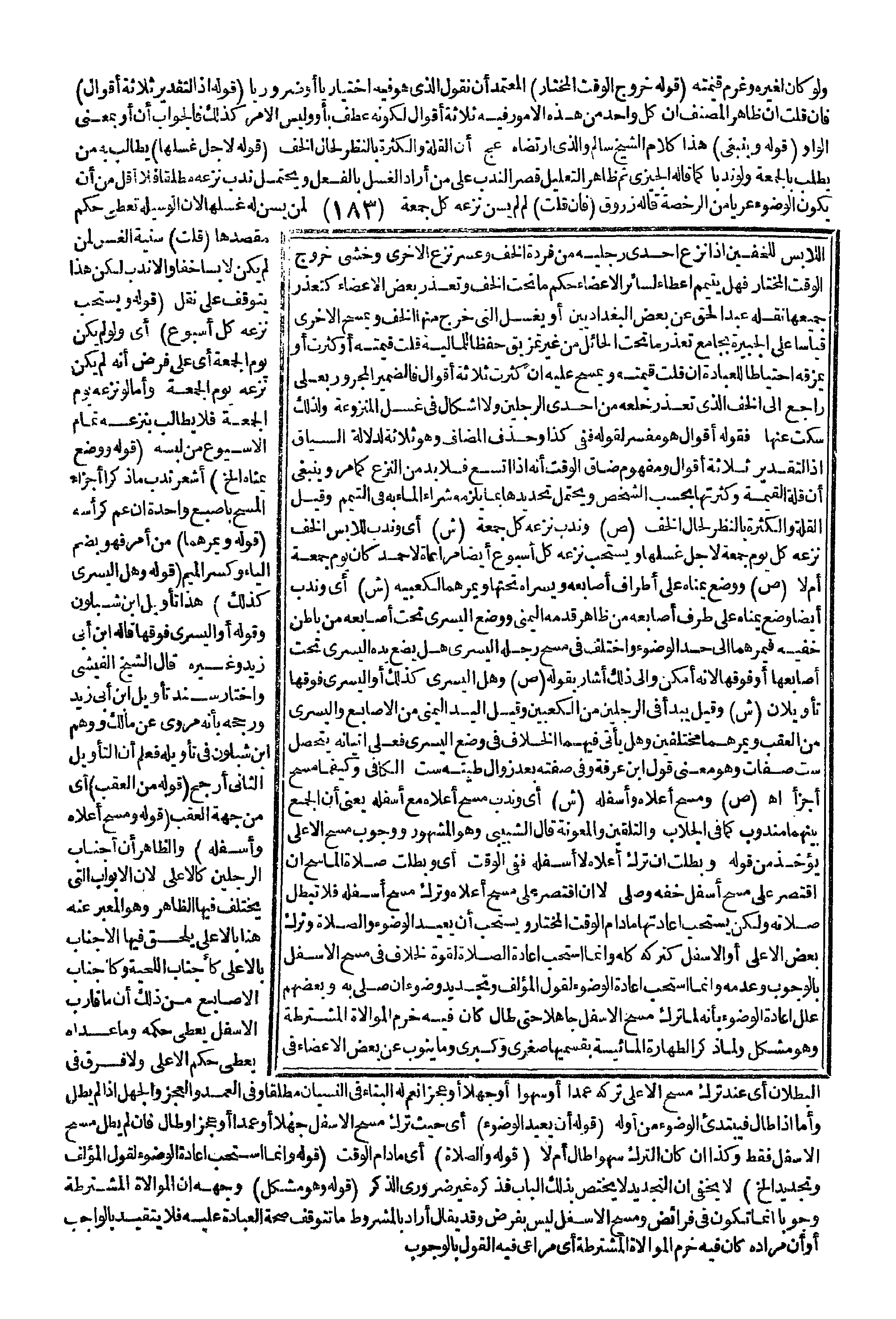 (قَوْلُهُ: وَمَسَحَ أَعْلَاهُ وَأَسْفَلَهُ) وَالظَّاهِرُ أَنَّ أَجْنَابَ الرِّجْلَيْنِ كَالْأَعْلَى لِأَنَّ الْأَبْوَابَ الَّتِي يَخْتَلِفُ فِيهَا الظَّاهِرُ وَهُوَ الْمُعَبَّرُ عَنْهُ هُنَا بِالْأَعْلَى يُلْحَقُ فِيهَا الْأَجْنَابُ بِالْأَعْلَى كَأَجْنَابِ اللِّحْيَةِ وَكَأَجْنَابِ الْأَصَابِعِ مِنْ ذَلِكَ أَنَّ مَا قَارَبَ الْأَسْفَلَ يُعْطَى حُكْمَهُ وَمَا عَدَاهُ يُعْطَى حُكْمَ الْأَعْلَى وَلَا فَرْقَ فِي الْبُطْلَانِ أَيْ عِنْدَ تَرْكِ مَسْحِ الْأَعْلَى تَرَكَهُ عَمْدًا أَوْ سَهْوًا أَوْ جَهْلًا أَوْ عَجْزًا نَعَمْ لَهُ الْبِنَاءُ فِي النِّسْيَانِ مُطْلَقًا وَفِي الْعَمْدِ وَالْعَجْزِ وَالْجَهْلِ إذَا لَمْ يَطُلْ وَأَمَّا إذَا طَالَ فَيَبْتَدِئُ الْوُضُوءَ مِنْ أَوَّلِهِ (قَوْلُهُ: يُعِيدُ الْوُضُوءَ) أَيْ حَيْثُ تَرَكَ مَسْحَ الْأَسْفَلِ جَهْلًا أَوْ عَمْدًا أَوْ عَجْزًا وَطَالَ فَإِنْ لَمْ يَطُلْ مَسَحَ الْأَسْفَلَ فَقَطْ وَكَذَا إنْ كَانَ التَّرْكُ سَهْوًا طَالَ أَمْ لَا (قَوْلُهُ: وَالصَّلَاةُ) أَيْ مَا دَامَ الْوَقْتُ (قَوْلُهُ: وَإِنَّمَا اُسْتُحِبَّ إعَادَةُ الْوُضُوءِ لِقَوْلِ الْمُؤَلِّفِ وَتَجْدِيدُ إلَخْ) لَا يَخْفَى أَنَّ التَّجْدِيدَ لَا يَخْتَصُّ بِذَلِكَ الْبَابِ فَذِكْرُهُ غَيْرُ ضَرُورِيِّ الذِّكْرِ (قَوْلُهُ: وَهُوَ مُشْكِلٌ) وَجْهُهُ أَنَّ الْمُوَالَاةَ الْمُشْتَرَطَةَ وُجُوبًا إنَّمَا تَكُونُ فِي فَرَائِضَ، وَمَسْحُ الْأَسْفَلِ لَيْسَ بِفَرْضٍ وَقَدْ يُقَالُ أَرَادَ بِالْمَشْرُوطِ مَا تَتَوَقَّفُ صِحَّةُ الْعِبَادَةِ عَلَيْهِ فَلَا يَتَقَيَّدُ بِالْوَاجِبِ أَوْ أَنَّ مُرَادَهُ كَانَ فِيهِ حَرَّمَ الْمُوَالَاةَ الْمُشْتَرَطَةَ أَيْ مُرَاعًى فِيهِ الْقَوْلُ بِالْوُجُوبِ.