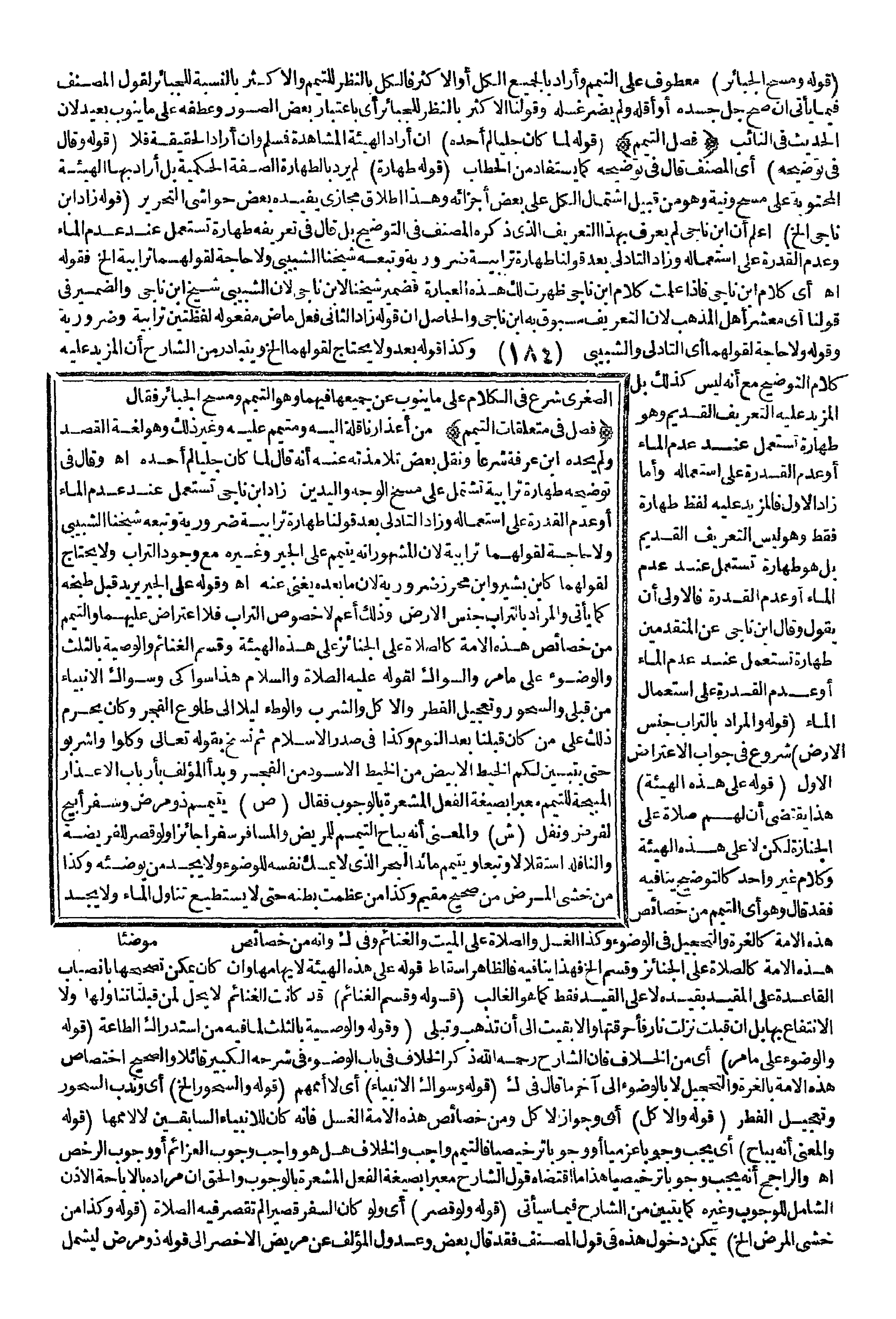 وَقَوْلُهُ عَلَى الْجِيرِ يُرِيدُ قَبْلَ طَبْخِهِ كَمَا يَأْتِي وَالْمُرَادُ بِالتُّرَابِ جِنْسُ الْأَرْضِ وَذَلِكَ أَعَمُّ لَا خُصُوصُ التُّرَابِ فَلَا اعْتِرَاضَ عَلَيْهِمَا وَالتَّيَمُّمُ مِنْ خَصَائِصِ هَذِهِ الْأُمَّةِ كَالصَّلَاةِ عَلَى الْجَنَائِزِ عَلَى هَذِهِ الْهَيْئَةِ وَقَسْمُ الْغَنَائِمِ وَالْوَصِيَّةُ بِالثُّلُثِ وَالْوُضُوءُ عَلَى مَا مَرَّ وَالسِّوَاكُ لِقَوْلِهِ: - عَلَيْهِ الصَّلَاةُ وَالسَّلَامُ - «هَذَا سِوَاكِي وَسِوَاكُ الْأَنْبِيَاءِ مِنْ قَبْلِي» وَالسُّحُورُ وَتَعْجِيلُ الْفِطْرِ وَالْأَكْلُ وَالشُّرْبُ وَالْوَطْءُ لَيْلًا إلَى طُلُوعِ الْفَجْرِ وَكَانَ يَحْرُمُ ذَلِكَ عَلَى مَنْ كَانَ قَبْلَنَا بَعْدَ النَّوْمِ وَكَذَا فِي صَدْرِ الْإِسْلَامِ ثُمَّ نُسِخَ بِقَوْلِهِ تَعَالَى {وَكُلُوا وَاشْرَبُوا حَتَّى يَتَبَيَّنَ لَكُمُ الْخَيْطُ الأَبْيَضُ مِنَ الْخَيْطِ الأَسْوَدِ مِنَ الْفَجْرِ} [البقرة: 187] وَبَدَأَ الْمُؤَلِّفُ بِأَرْبَابِ الْأَعْذَارِ الْمُبِيحَةِ لِلتَّيَمُّمِ مُعَبِّرًا بِصِيغَةِ الْفِعْلِ الْمُشْعِرَةِ بِالْوُجُوبِ فَقَالَ