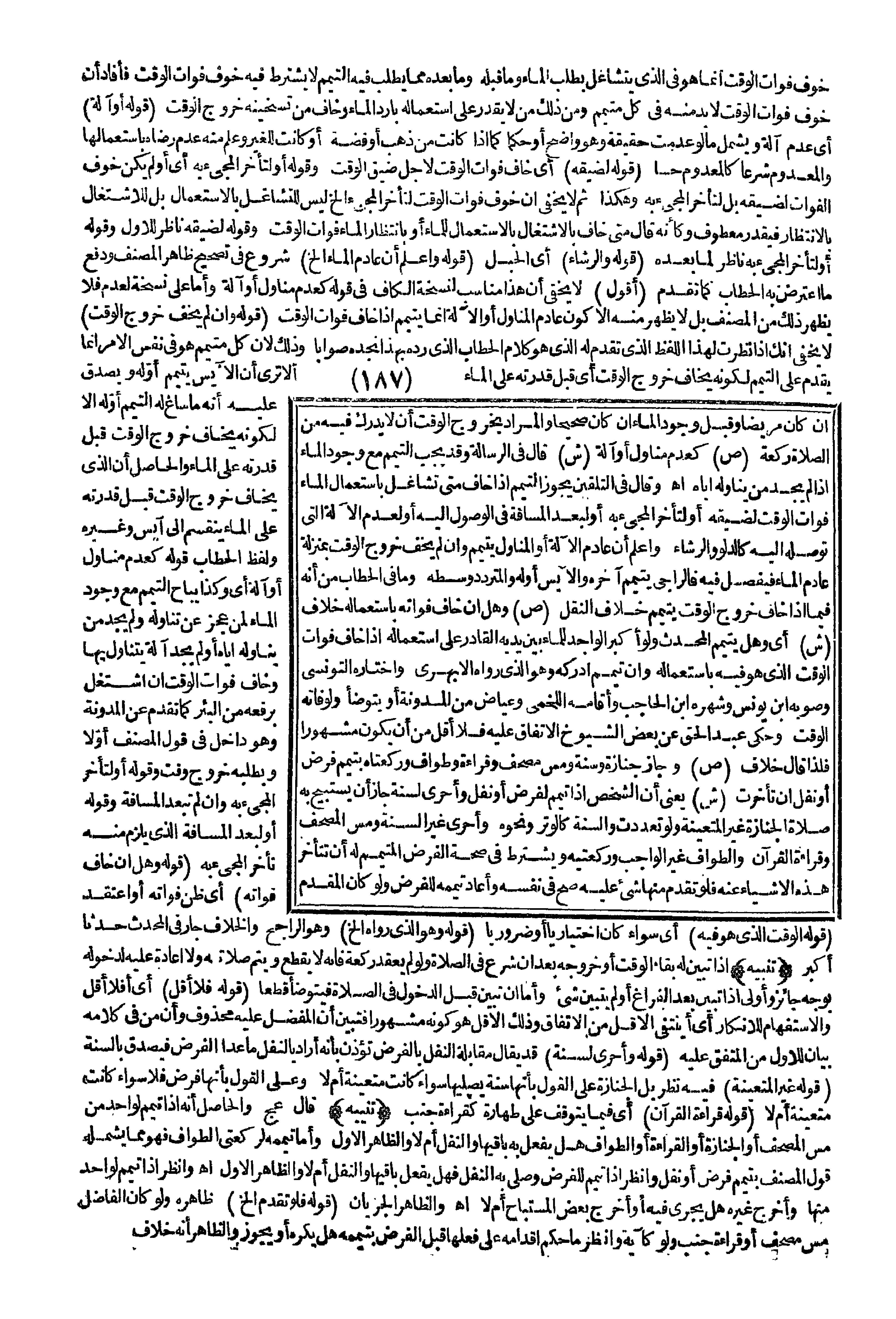 (ص) وَهَلْ إنْ خَافَ فَوَاتَهُ بِاسْتِعْمَالِهِ خِلَافٌ (ش) أَيْ وَهَلْ يَتَيَمَّمُ الْمُحْدِثُ وَلَوْ أَكْبَرَ الْوَاجِدُ لِلْمَاءِ بَيْنَ يَدَيْهِ الْقَادِرُ عَلَى اسْتِعْمَالِهِ إذَا خَافَ فَوَاتَ الْوَقْتِ الَّذِي هُوَ فِيهِ بِاسْتِعْمَالِهِ وَإِنْ تَيَمَّمَ أَدْرَكَهُ وَهُوَ الَّذِي رَوَاهُ الْأَبْهَرِيُّ وَاخْتَارَهُ التُّونِسِيُّ وَصَوَّبَهُ ابْنُ يُونُسَ وَشَهَرَهُ ابْنُ الْحَاجِبِ وَأَقَامَهُ اللَّخْمِيُّ وَعِيَاضٌ مِنْ الْمُدَوَّنَةِ أَوْ يَتَوَضَّأُ وَلَوْ فَاتَهُ الْوَقْتُ وَحَكَى عَبْدُ الْحَقِّ عَنْ بَعْضِ الشُّيُوخِ الِاتِّفَاقَ عَلَيْهِ فَلَا أَقَلَّ مِنْ أَنْ يَكُونَ مَشْهُورًا فَلِذَا قَالَ خِلَافٌ.