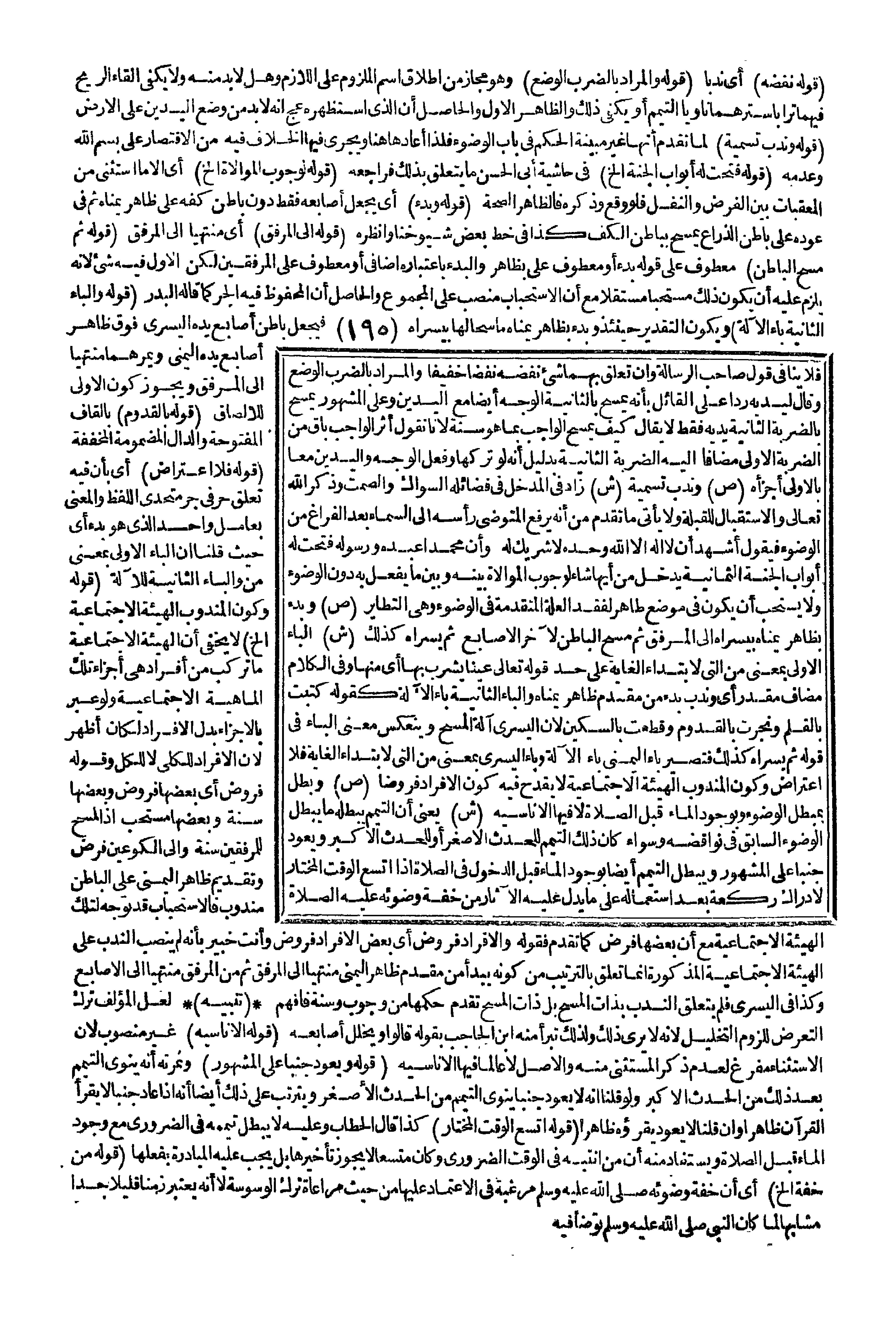 (قَوْلُهُ: وَبَدْءٌ) أَيْ يَجْعَلُ أَصَابِعَهُ فَقَطْ دُونَ بَاطِنِ كَفِّهِ عَلَى ظَاهِرِ يُمْنَاهُ ثُمَّ فِي عَوْدِهِ عَلَى بَاطِنِ الذِّرَاعِ يَمْسَحُ بِبَاطِنِ الْكَفِّ كَذَا فِي خَطِّ بَعْضِ شُيُوخِنَا وَانْظُرْهُ (قَوْلُهُ: إلَى الْمِرْفَقِ) أَيْ مُنْتَهِيًا إلَى الْمِرْفَقِ (قَوْلُهُ: ثُمَّ مَسْحُ الْبَاطِنِ) مَعْطُوفٌ عَلَى قَوْلِهِ بَدْءٌ أَوْ مَعْطُوفٌ عَلَى بِظَاهِرٍ وَالْبَدْءُ بِاعْتِبَارِهِ إضَافِيٌّ أَوْ مَعْطُوفٌ عَلَى الْمِرْفَقَيْنِ لَكِنَّ الْأَوَّلَ فِيهِ شَيْءٌ لِأَنَّهُ يَلْزَمُ عَلَيْهِ أَنْ يَكُونَ ذَلِكَ مُسْتَحَبًّا مُسْتَقِلًّا مَعَ أَنَّ الِاسْتِحْبَابَ مُنْصَبٌّ عَلَى الْمَجْمُوعِ، وَالْحَاصِلُ أَنَّ الْمَحْفُوظَ فِيهِ الْجَرُّ كَمَا قَالَهُ الْبَدْرُ (قَوْلُهُ: وَالْبَاءُ الثَّانِيَةُ بَاءُ الْآلَةِ) وَيَكُونُ التَّقْدِيرُ حِينَئِذٍ وَبَدْءٌ بِظَاهِرِ يُمْنَاهُ مَاسِحًا لَهَا بِيُسْرَاهُ فَيَجْعَلُ بَاطِنَ أَصَابِعِ يَدِهِ الْيُسْرَى فَوْقَ ظَاهِرِ أَصَابِعِ يَدِهِ الْيُمْنَى وَيُمِرُّهُمَا مُنْتَهِيًا إلَى الْمِرْفَقِ وَيَجُوزُ كَوْنُ الْأُولَى لِلْإِلْصَاقِ (قَوْلُهُ: بِالْقَدُومِ) بِالْقَافِ الْمَفْتُوحَةِ وَالدَّالِ الْمَضْمُومَةِ الْمُخَفَّفَةِ (قَوْلُهُ: فَلَا اعْتِرَاضَ) أَيْ بِأَنَّ فِيهِ تَعَلُّقَ حَرْفَيْ جَرٍّ مُتَّحِدَيْ اللَّفْظِ وَالْمَعْنَى بِعَامِلٍ وَاحِدٍ الَّذِي هُوَ بَدْءٌ أَيْ حَيْثُ قُلْنَا إنَّ الْبَاءَ الْأُولَى بِمَعْنَى مِنْ وَالْبَاءُ الثَّانِيَةُ لِلْآلَةِ (قَوْلُهُ: وَكَوْنُ الْمَنْدُوبِ الْهَيْئَةَ الِاجْتِمَاعِيَّةَ إلَخْ) لَا يَخْفَى أَنَّ الْهَيْئَةَ الِاجْتِمَاعِيَّةَ مَا تَرَكَّبَ مِنْ أَفْرَادٍ هِيَ أَجْزَاءُ تِلْكَ الْمَاهِيَّةِ الِاجْتِمَاعِيَّةِ وَلَوْ عَبَّرَ بِالْأَجْزَاءِ بَدَلَ الْأَفْرَادِ لَكَانَ أَظْهَرَ لِأَنَّ الْأَفْرَادَ لِلْكُلِّيِّ لَا لِلْكُلِّ، وَقَوْلُهُ: (فُرُوضٌ) أَيْ بَعْضُهَا فُرُوضٌ وَبَعْضُهَا سُنَّةٌ وَبَعْضُهَا مُسْتَحَبٌّ إذْ الْمَسْحُ لِلْمِرْفَقَيْنِ سُنَّةٌ وَإِلَى الْكُوعَيْنِ فَرْضٌ وَتَقْدِيمُ ظَاهِرِ الْيُمْنَى عَلَى الْبَاطِنِ مَنْدُوبٌ فَالِاسْتِحْبَابُ قَدْ تَوَجَّهَ لِتِلْكَ الْهَيْئَةِ الِاجْتِمَاعِيَّةِ مَعَ أَنَّ بَعْضَهَا فَرْضٌ كَمَا تَقَدَّمَ فَقَوْلُهُ وَالْأَفْرَادُ فُرُوضٌ أَيْ بَعْضُ الْأَفْرَادِ فُرُوضٌ وَأَنْتَ خَبِيرٌ بِأَنَّهُ لَمْ يَنْصَبَّ النَّدْبُ عَلَى الْهَيْئَةِ الِاجْتِمَاعِيَّةِ الْمَذْكُورَةِ إنَّمَا تَعَلَّقَ بِالتَّرْتِيبِ مِنْ كَوْنِهِ يَبْدَأُ مِنْ مُقَدَّمِ ظَاهِرِ الْيُمْنَى مُنْتَهِيًا إلَى الْمِرْفَقِ ثُمَّ مِنْ الْمِرْفَقِ مُنْتَهِيًا إلَى الْأَصَابِعِ وَكَذَا فِي الْيُسْرَى فَلَمْ يَتَعَلَّقْ النَّدْبُ بِذَاتِ الْمَسْحِ بَلْ ذَاتُ الْمَسْحِ تَقَدَّمَ حُكْمُهَا مِنْ وُجُوبٍ وَسُنَّةٍ فَافْهَمْ.