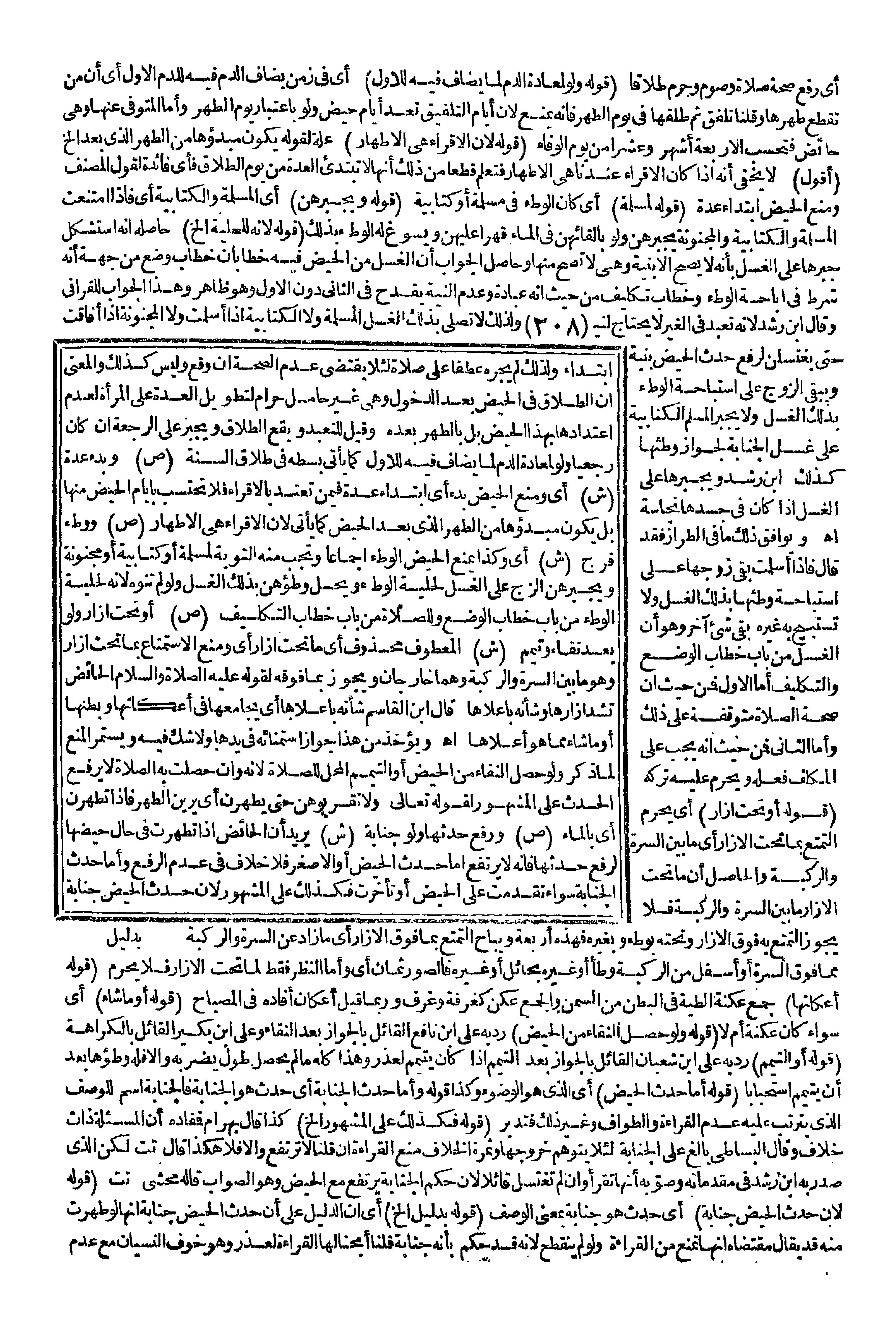 وَيُوَافِقُ ذَلِكَ مَا فِي الطِّرَازِ فَقَدْ قَالَ: فَإِذَا أَسْلَمَتْ بَقِيَ زَوْجُهَا عَلَى اسْتِبَاحَةِ وَطْئِهَا بِذَلِكَ الْغُسْلِ وَلَا تَسْتَبِيحُ بِهِ غَيْرَهُ بَقِيَ شَيْءٌ آخَرُ وَهُوَ أَنَّ الْغُسْلَ مِنْ بَابِ خِطَابِ الْوَضْعِ، وَالتَّكْلِيفِ أَمَّا الْأَوَّلُ فَمِنْ حَيْثُ إنَّ صِحَّةَ الصَّلَاةِ مُتَوَقِّفَةٌ عَلَى ذَلِكَ، وَأَمَّا الثَّانِي فَمِنْ حَيْثُ إنَّهُ يَجِبُ عَلَى الْمُكَلَّفِ فِعْلُهُ وَيَحْرُمُ عَلَيْهِ تَرْكُهُ (قَوْلُهُ: أَوْ تَحْتَ إزَارٍ) أَيْ يَحْرُمُ التَّمَتُّعُ بِمَا تَحْتَ الْإِزَارِ أَيْ مَا بَيْنَ السُّرَّةِ، وَالرُّكْبَةِ، وَالْحَاصِلُ أَنَّ مَا تَحْتَ الْإِزَارِ مَا بَيْنَ السُّرَّةِ، وَالرُّكْبَةِ فَلَا يَجُوزُ التَّمَتُّعُ بِهِ فَوْقَ الْإِزَارِ وَتَحْتَهُ بِوَطْءٍ وَبِغَيْرِهِ فَهَذِهِ أَرْبَعَةٌ وَيُبَاحُ التَّمَتُّعُ بِمَا فَوْقَ الْإِزَارِ مَا زَادَ عَنْ السُّرَّةِ، وَالرُّكْبَةِ مِمَّا فَوْقَ السُّرَّةِ أَوْ أَسْفَلَ مِنْ الرُّكْبَةِ وَطْئًا أَوْ غَيْرَهُ بِحَائِلٍ أَوْ غَيْرِهِ فَالصُّوَرُ ثَمَانٍ أَيْ، وَأَمَّا النَّظَرُ فَقَطْ لِمَا تَحْتَ الْإِزَارِ فَلَا يَحْرُمُ (قَوْلُهُ: أَعْكَانِهَا) جَمْعُ عُكْنَةٍ الطَّيَّةُ فِي الْبَطْنِ مِنْ السِّمَنِ، وَالْجَمْعُ عُكَنٌ كَغَرْفَةٍ وَغُرَفٍ رُبَّمَا قِيلَ أَعْكَانٌ أَفَادَهُ فِي الْمِصْبَاحِ (قَوْلُهُ: أَوْ مَا شَاءَ) أَيْ سَوَاءٌ كَانَ عُكْنَةً أَمْ لَا (قَوْلُهُ: وَلَوْ حَصَلَ النَّقَاءُ مِنْ الْحَيْضِ) رَدَّ بِهِ عَلَى ابْنِ نَافِعٍ الْقَائِلِ بِالْجَوَازِ بَعْدَ النَّقَاءِ وَعَلَى ابْنِ بُكَيْرٍ الْقَائِلِ بِالْكَرَاهَةِ (قَوْلُهُ: أَوْ التَّيَمُّمُ) رُدَّ بِهِ عَلَى ابْنِ شَعْبَانَ الْقَائِلِ بِالْجَوَازِ بَعْدَ التَّيَمُّمِ إذَا كَانَ يَتَيَمَّمُ لِعُذْرٍ وَهَذَا كُلُّهُ مَا لَمْ يَحْصُلْ طُولٌ يَضُرُّ بِهِ وَإِلَّا فَلَهُ وَطْؤُهَا بَعْدَ أَنْ يَتَيَمَّمَ اسْتِحْبَابًا (قَوْلُهُ: أَمَّا حَدَثُ الْحَيْضِ) أَيْ الَّذِي هُوَ الْوُضُوءُ.