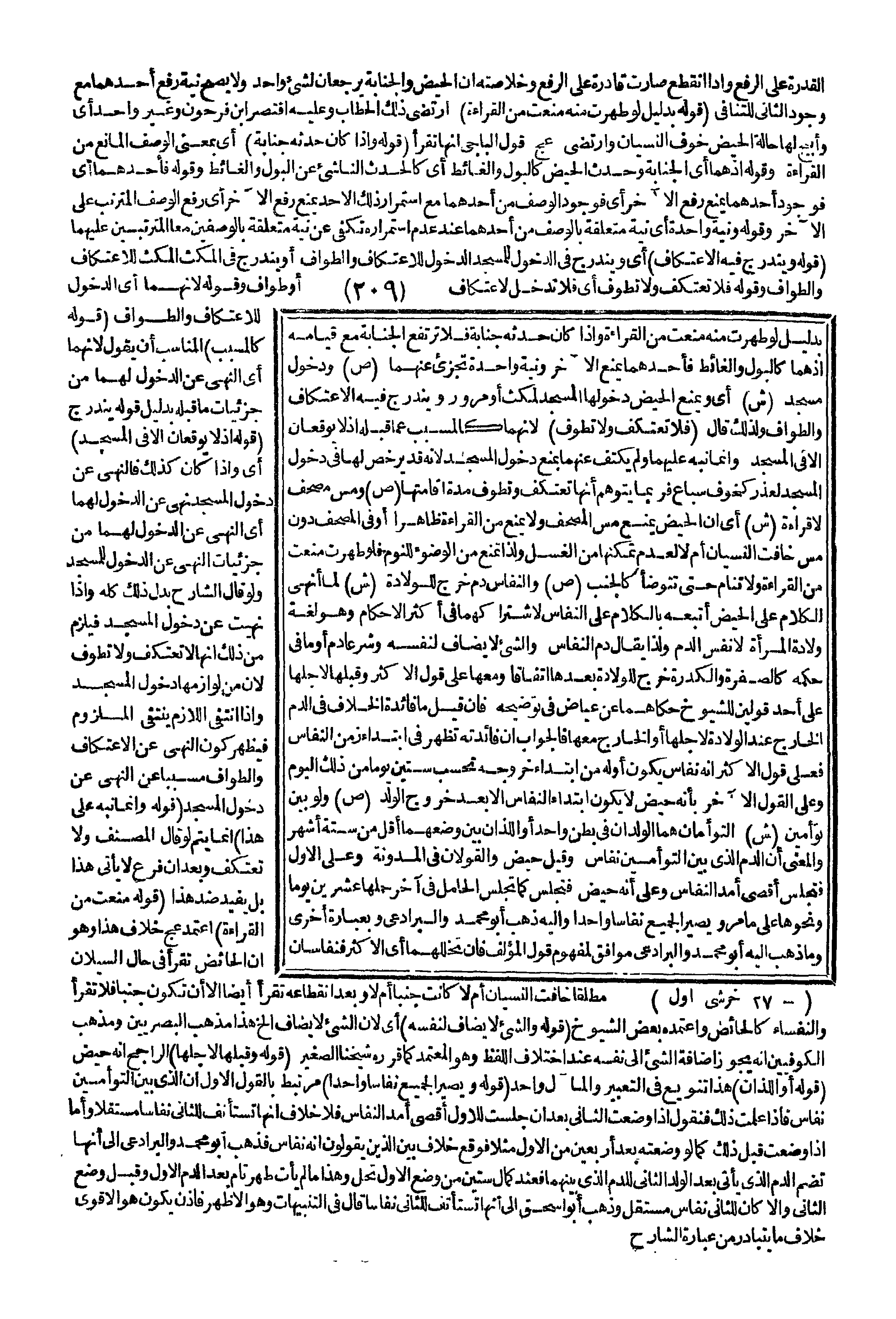 (قَوْلُهُ: وَإِذَا كَانَ حَدَثُهُ جَنَابَةً) أَيْ بِمَعْنَى الْوَصْفِ الْمَانِعِ مِنْ الْقِرَاءَةِ، وَقَوْلُهُ إذْ هُمَا أَيْ الْجَنَابَةُ وَحَدَثُ الْحَيْضِ كَالْبَوْلِ، وَالْغَائِطُ أَيْ كَالْحَدَثِ النَّاشِئِ عَنْ الْبَوْلِ، وَالْغَائِطِ، وَقَوْلُهُ: فَأَحَدُهُمَا أَيْ فَوُجُودُ أَحَدِهِمَا يَمْنَعُ رَفْعَ الْآخَرِ أَيْ فَوُجُودُ الْوَصْفِ مِنْ أَحَدِهِمَا مَعَ اسْتِمْرَارِ ذَلِكَ إلَّا حَدٌّ يَمْنَعُ رَفْعَ الْآخَرِ أَيْ رَفْعَ الْوَصْفِ الْمُتَرَتِّبِ عَلَى الْآخَرِ، وَقَوْلُهُ: وَنِيَّةٌ وَاحِدَةٌ أَيْ نِيَّةٌ مُتَعَلِّقَةٌ بِالْوَصْفِ مِنْ أَحَدِهِمَا عِنْدَ عَدَمِ اسْتِمْرَارِهِ تَكْفِي عَنْ نِيَّةٍ مُتَعَلِّقَةٍ بِالْوَصْفَيْنِ مَعًا الْمُتَرَتِّبَيْنِ عَلَيْهِمَا (قَوْلُهُ: وَيَنْدَرِجُ فِيهِ الِاعْتِكَافُ) أَيْ وَيَنْدَرِجُ فِي الدُّخُولِ لِلْمَسْجِدِ لِلِاعْتِكَافِ، وَالطَّوَافِ أَوْ يَنْدَرِجُ فِي الْمُكْثِ الْمُكْثُ لِلِاعْتِكَافِ، وَالطَّوَافِ وَقَوْلُهُ: فَلَا تَعْتَكِفُ وَلَا تَطُوفُ أَيْ فَلَا تَدْخُلُ لِاعْتِكَافٍ أَوْ طَوَافٍ وَقَوْلُهُ لِأَنَّهُمَا أَيْ الدُّخُولَ لِلِاعْتِكَافِ، وَالطَّوَافَ (قَوْلُهُ: كَالْمُسَبَّبِ) الْمُنَاسِبُ أَنْ يَقُولَ لِأَنَّهُمَا أَيْ النَّهْيَ عَنْ الدُّخُولِ لَهُمَا مِنْ جُزْئِيَّاتِ مَا قَبْلَهُ بِدَلِيلِ قَوْلِهِ يَنْدَرِجُ (قَوْلُهُ: إذْ لَا يُوقَعَانِ إلَّا فِي الْمَسْجِدِ) أَيْ وَإِذَا كَانَ كَذَلِكَ فَالنَّهْيُ عَنْ دُخُولِ الْمَسْجِدِ نَهْيٌ عَنْ الدُّخُولِ لَهُمَا أَيْ النَّهْيُ عَنْ الدُّخُولِ لَهُمَا مِنْ جُزْئِيَّاتِ النَّهْيِ عَنْ الدُّخُولِ لِلْمَسْجِدِ وَلَوْ قَالَ الشَّارِحُ بَدَلَ ذَلِكَ كُلِّهِ وَإِذَا نُهِيَتْ عَنْ دُخُولِ الْمَسْجِدِ فَيَلْزَمُ مِنْ ذَلِكَ أَنَّهَا لَا تَعْتَكِفُ وَلَا تَطُوفُ لِأَنَّ مِنْ لُزُومِهَا دُخُولَ الْمَسْجِدِ وَإِذَا انْتَفَى اللَّازِمُ يَنْتَفِي الْمَلْزُومُ فَيَظْهَرُ كَوْنُ النَّهْيِ عَنْ الِاعْتِكَافِ، وَالطَّوَافِ مُسَبَّبًا عَنْ النَّهْيِ عَنْ دُخُولِ الْمَسْجِدِ.