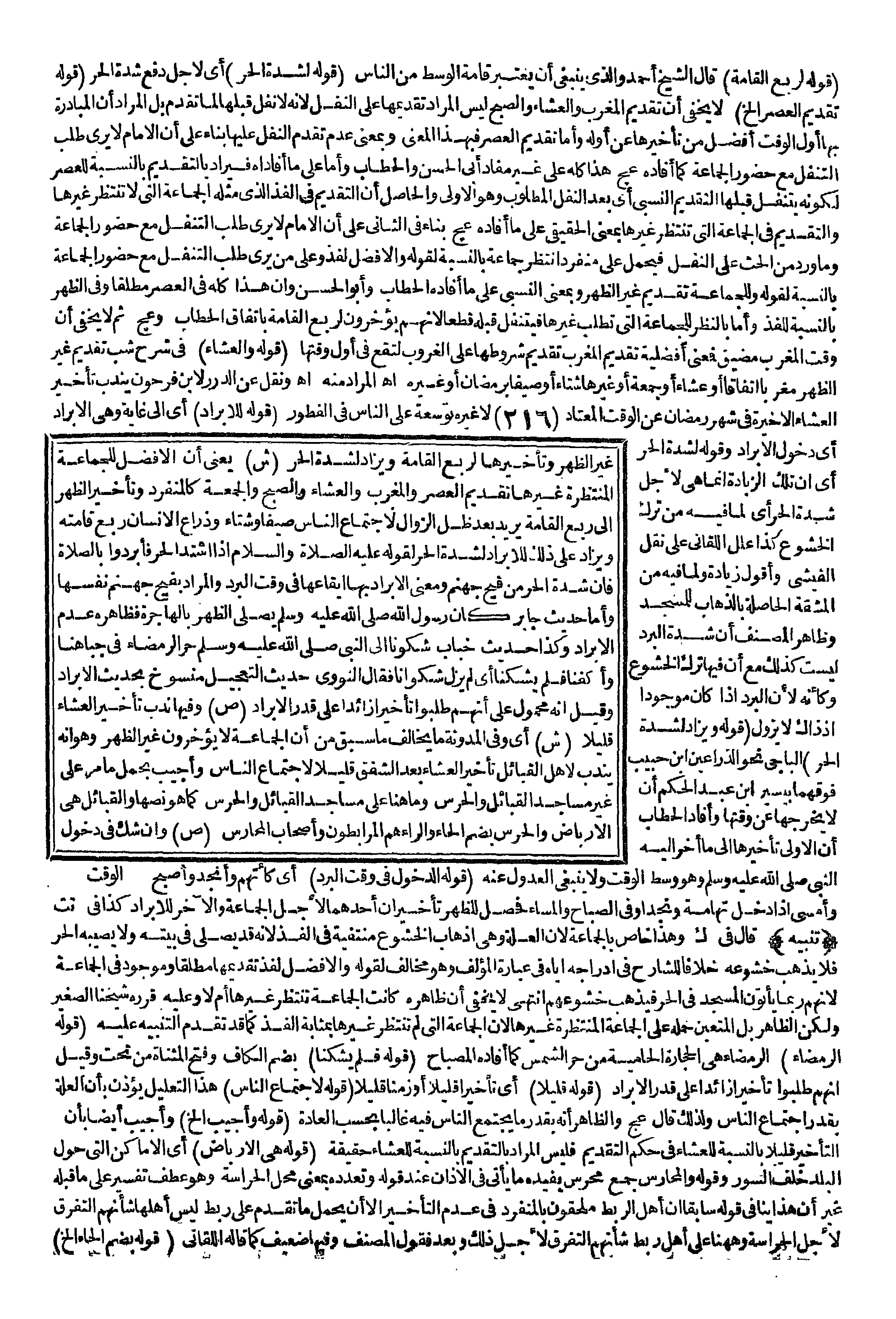 غَيْرِ الظُّهْرِ وَتَأْخِيرُهَا لِرُبْعِ الْقَامَةِ وَيُزَادُ لِشِدَّةِ الْحَرِّ (ش) يَعْنِي أَنَّ الْأَفْضَلَ لِلْجَمَاعَةِ الْمُنْتَظِرَةِ غَيْرَهَا تَقْدِيمُ الْعَصْرِ وَالْمَغْرِبِ وَالْعِشَاءِ وَالصُّبْحِ وَالْجُمُعَةِ كَالْمُنْفَرِدِ وَتَأْخِيرُ الظُّهْرِ إلَى رُبْعِ الْقَامَةِ يُرِيدُ بَعْدَ ظِلِّ الزَّوَالِ لِاجْتِمَاعِ النَّاسِ صَيْفًا وَشِتَاءً، وَذِرَاعُ الْإِنْسَانِ رُبُعُ قَامَتِهِ وَيُزَادُ عَلَى ذَلِكَ لِلْإِبْرَادِ لِشِدَّةِ الْحَرِّ لِقَوْلِهِ - عَلَيْهِ الصَّلَاةُ وَالسَّلَامُ - «إذَا اشْتَدَّ الْحَرُّ فَأَبْرِدُوا بِالصَّلَاةِ فَإِنَّ شِدَّةَ الْحَرِّ مِنْ فَيْحِ جَهَنَّمَ» وَمَعْنَى الْإِبْرَادِ بِهَا إيقَاعُهَا وَفِي وَقْتِ الْبَرْدِ وَالْمُرَادُ بِفَيْحِ جَهَنَّمَ نَفَسُهَا