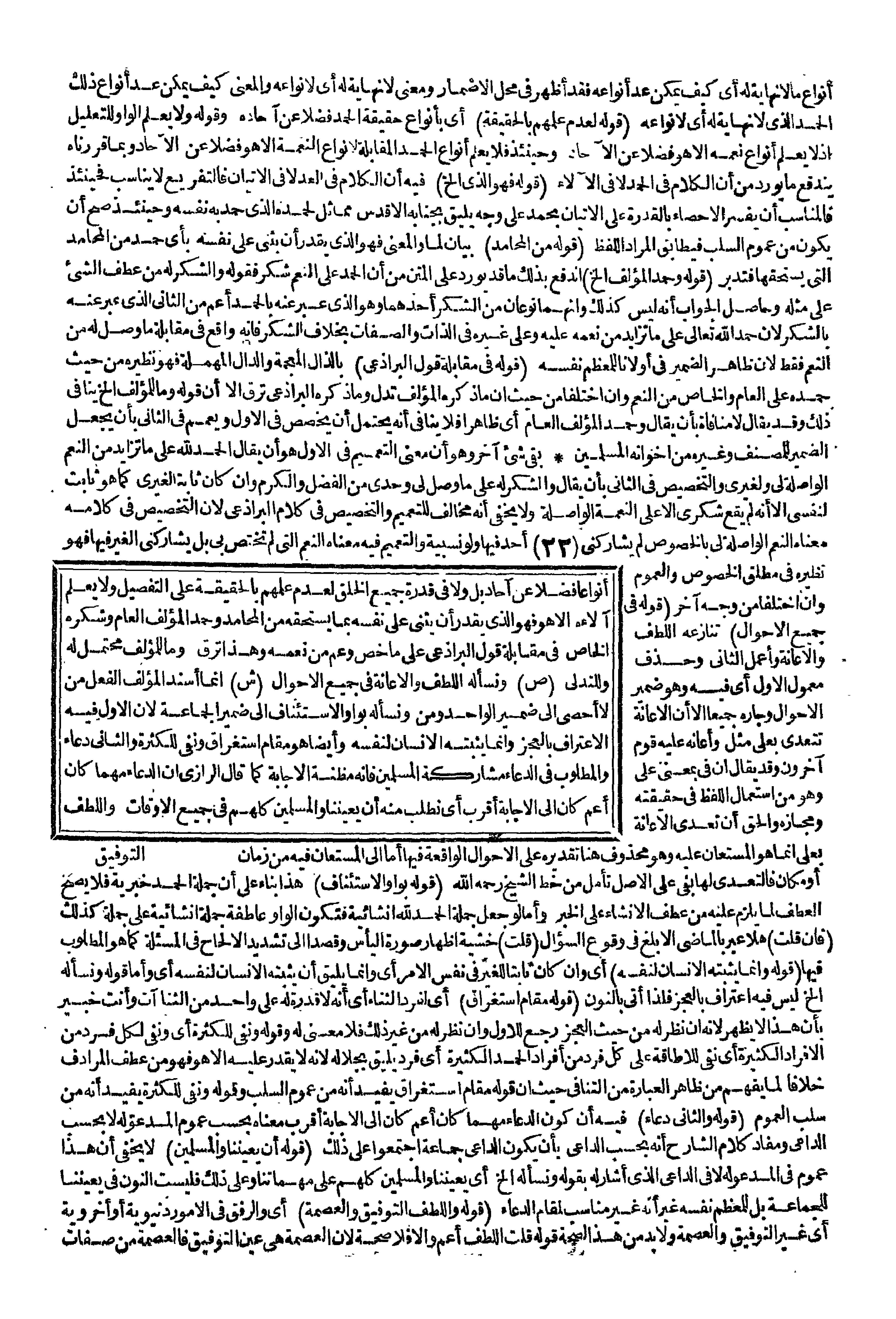 أَنْوَاعًا فَضْلًا عَنْ آحَادِ بَلْ وَلَا فِي قُدْرَةِ جَمِيعِ الْخَلْقِ لِعَدَمِ عِلْمِهِمْ بِالْحَقِيقَةِ عَلَى التَّفْصِيلِ وَلَا يَعْلَمُ آلَاءَهُ إلَّا هُوَ فَهُوَ الَّذِي يَقْدِرُ أَنْ يُثْنِيَ عَلَى نَفْسِهِ بِمَا يَسْتَحِقُّهُ مِنْ الْمَحَامِدِ وَحَمْدُ الْمُؤَلِّفِ الْعَامُّ وَشُكْرُهُ الْخَاصُّ فِي مُقَابَلَةِ قَوْلِ الْبَرَاذِعِيِّ عَلَى مَا خَصَّ وَعَمَّ مِنْ نِعْمَةٍ وَهَذَا تَرَفٌ وَمَا لَلْمُؤَلِّفِ مُحْتَمَلٌ لَهُ وَلِلتَّدَلِّي.